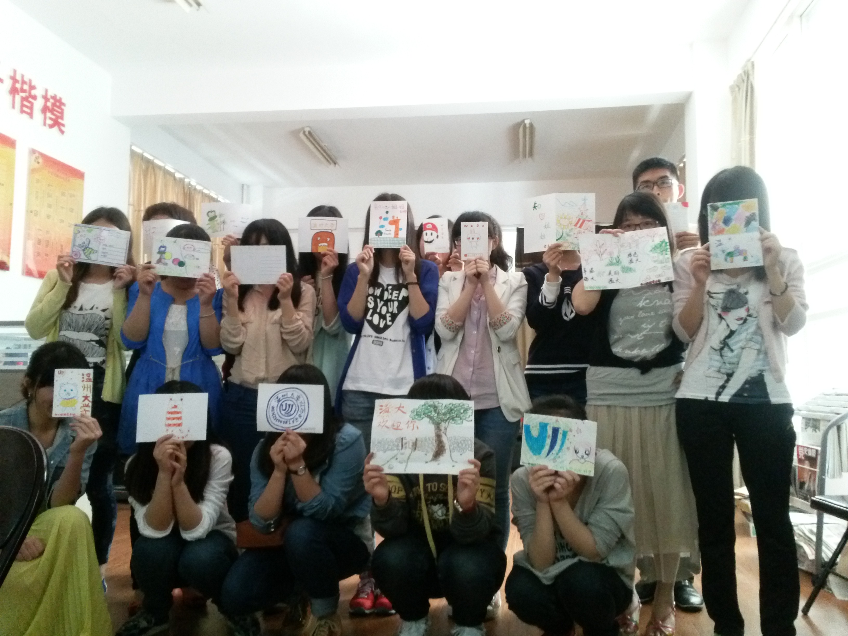 等待着你的到来”“猜猜里面哪个是文文和达达”;有些同学则是用色彩丰富的线条简单的勾勒出温大的独特风景,如育英图书馆,天鹅湖,温大东大门建筑等,虽然在绘画水准上,同学们并不是专业的,但是对于温大校庆的热情和喜悦,对于母校的祝福却不输任何人!