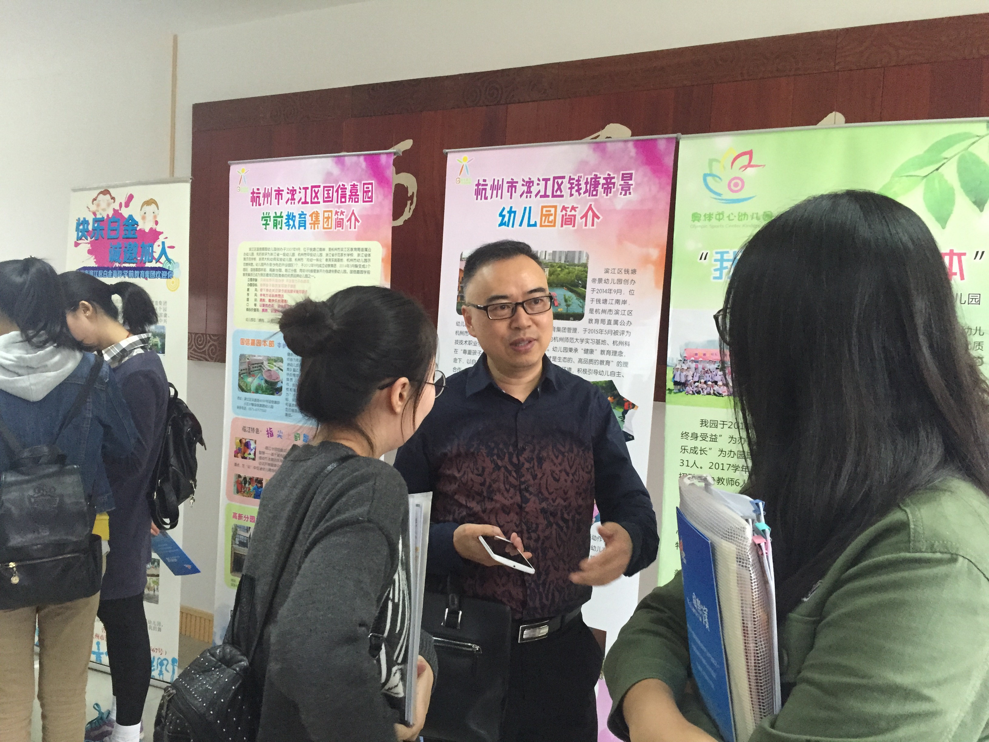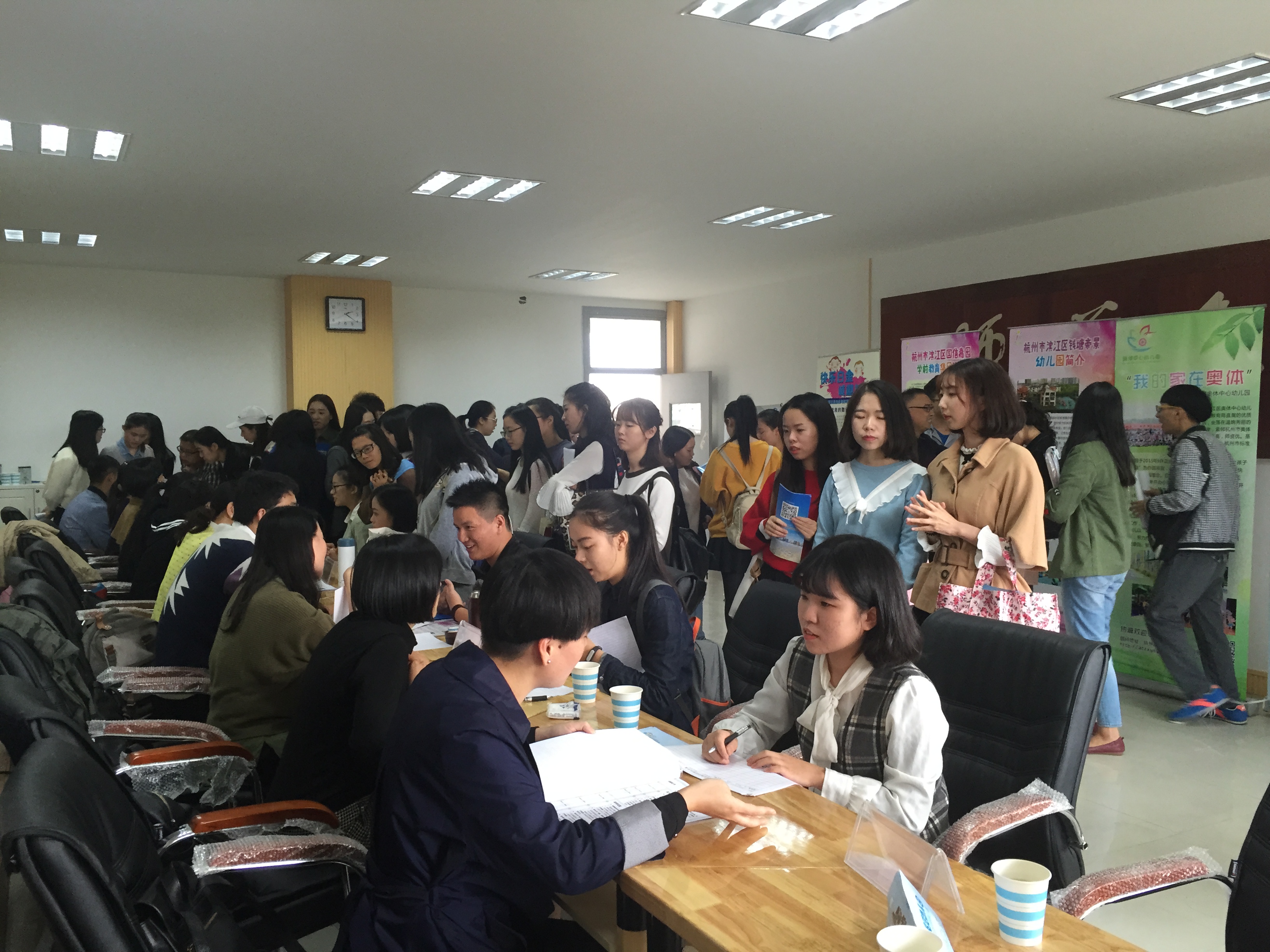 隆重举行。杭州市滨江区教育局携湖畔幼儿园,国信嘉园幼儿园,浦沿街道幼儿园,白金幼儿园,奥体中心幼儿园,月亮湾幼儿园出席招聘会现场,他们为我校学前教育毕业生带来了许多岗位。到场的还有我校学前教育专业的许多优秀学生,招聘会场面火爆。