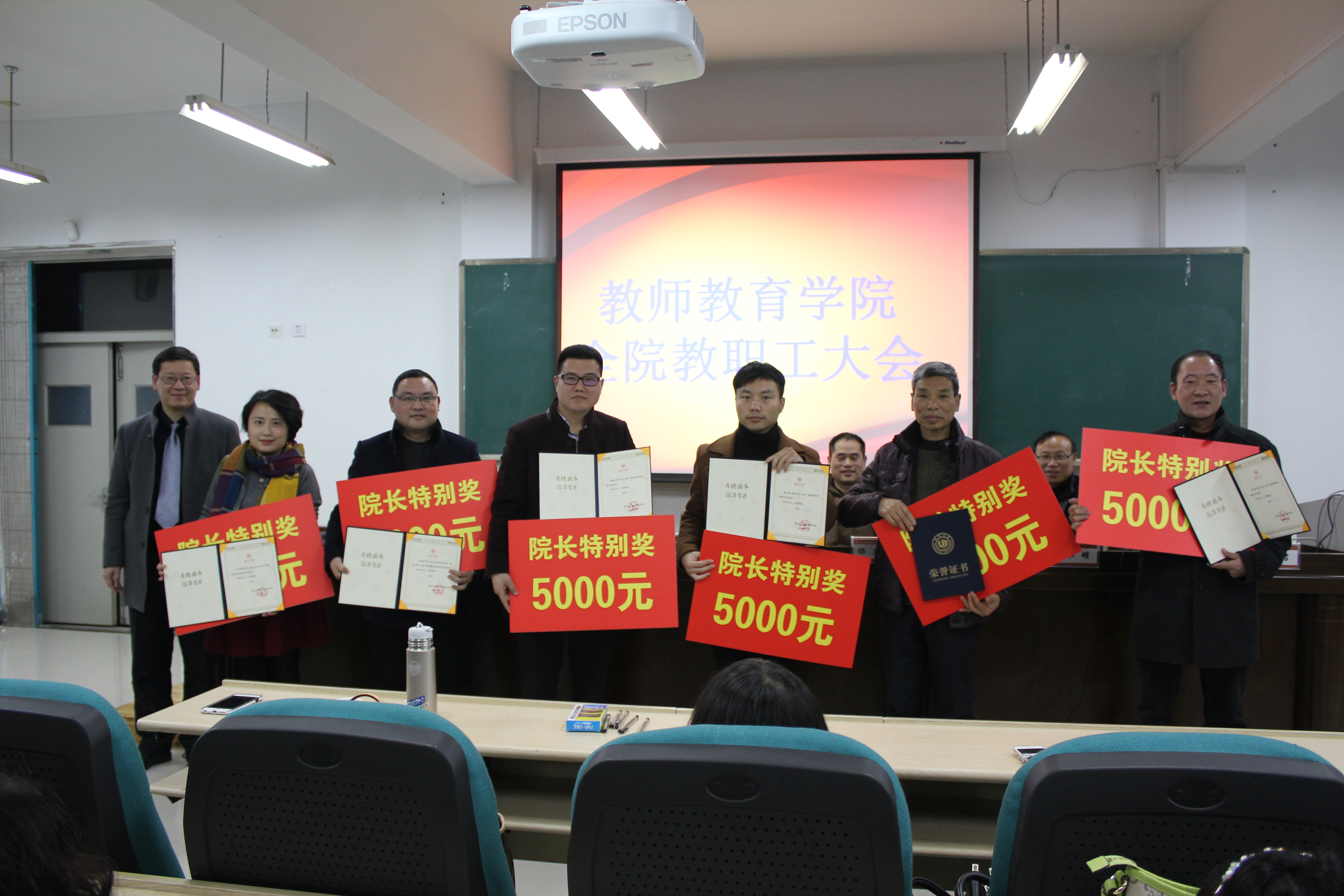 会议表彰了2015年院长特别奖获得者、2015年就业工作先进个人(集体)和2015年院工会活动积极分子。胡瑜、颜文靖、罗顺文、陈正枫等4位老师以及行政管理团队、小教专业学生竞赛指导团队等2个团队荣获了2015年院长特别奖。折延东、盛建森、李伟、张龙、徐平、陈铿、朱春桃、章伟丹等八位老师及学生科获得了就业奖励。朱伟、金荣乾、折延东、谭莉、严晓秋、胡铸鑫、邵胜男等7位老师获得了工会活动积极分子的奖励。