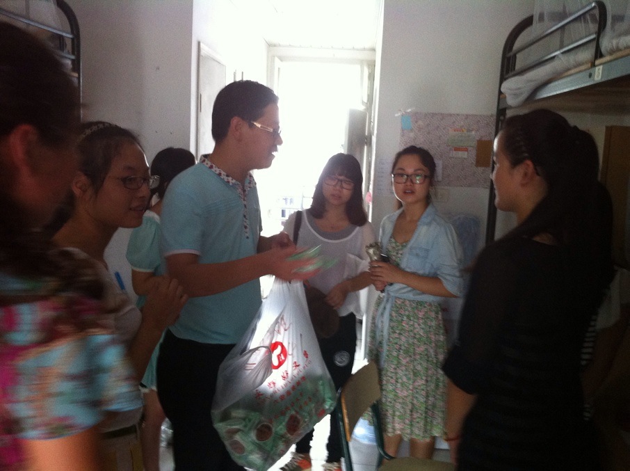 中午刚吃完午饭,老师们就匆匆赶到C4楼下,与同学们一起将月饼装袋,然后和同学们一起前往各幢寝室楼,将月饼发到91吃瓜