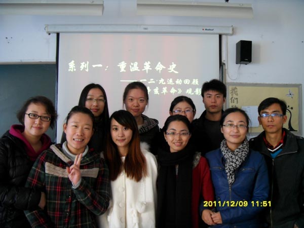 活动在对一·二九学生运动的回顾中拉开帷幕,张成书记通过丰富的影像资料为大家再现那场由中国共产党领导、北平大中学生数千人参加的抗日救国示威游行。与会全体人员似乎亲耳听到“停止内战、一致抗日”的激昂口号,老照片中那一张张年轻但却坚毅的爱国面孔,无一不令人心生敬佩。生动回顾后,带着激愤的爱国情绪,全体与会人员观看了影片《辛亥革命》,并学习了《胡锦涛同志纪念辛亥革命100周年大会重要讲话》。