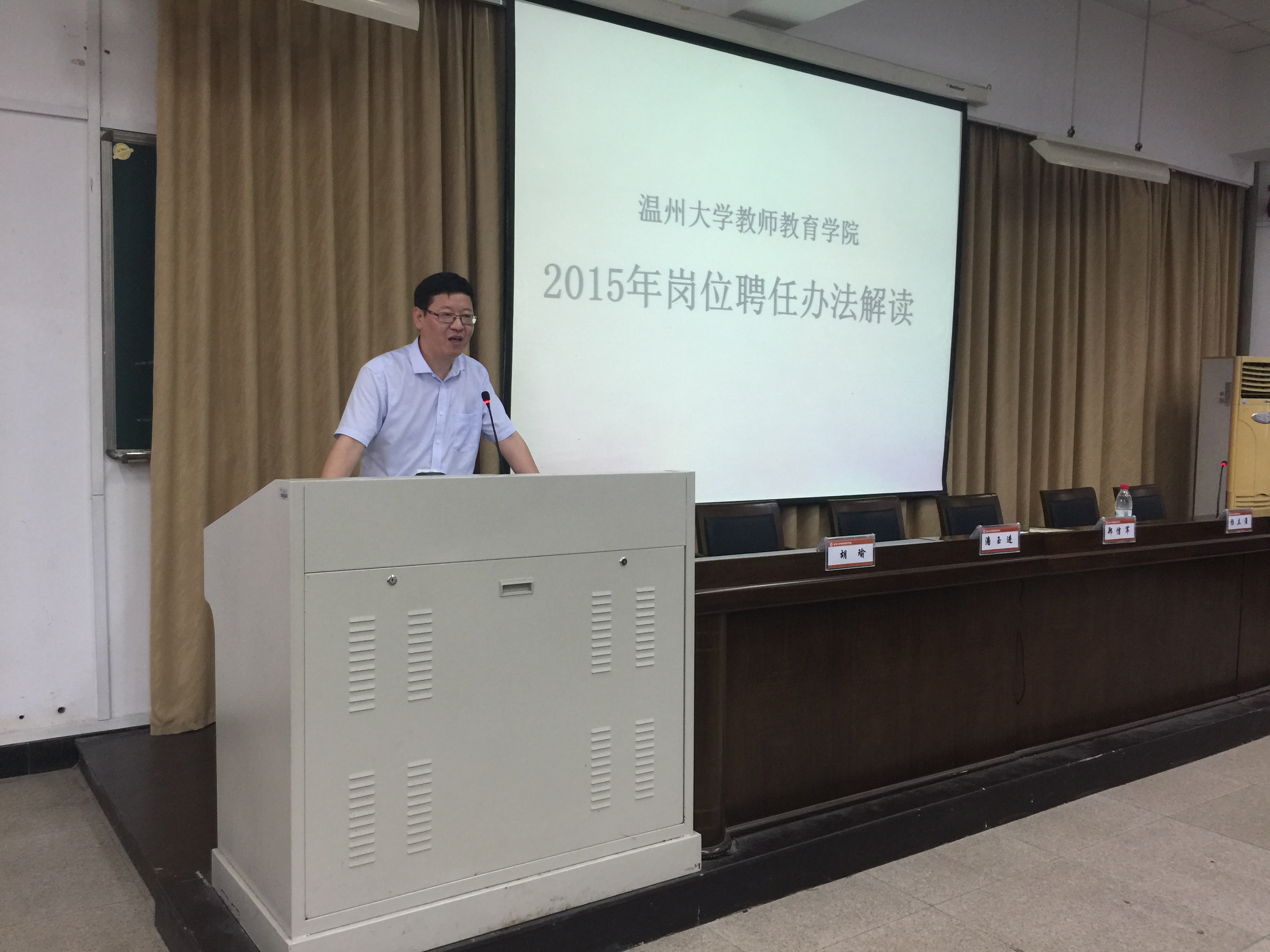第二项议程是2015年岗位聘任工作动员。郑信军院长向全院教师介绍了学校关于本轮岗位聘任工作的文件精神,并仔细解读了学院在这次聘任工作中的实施方案及分级办法。