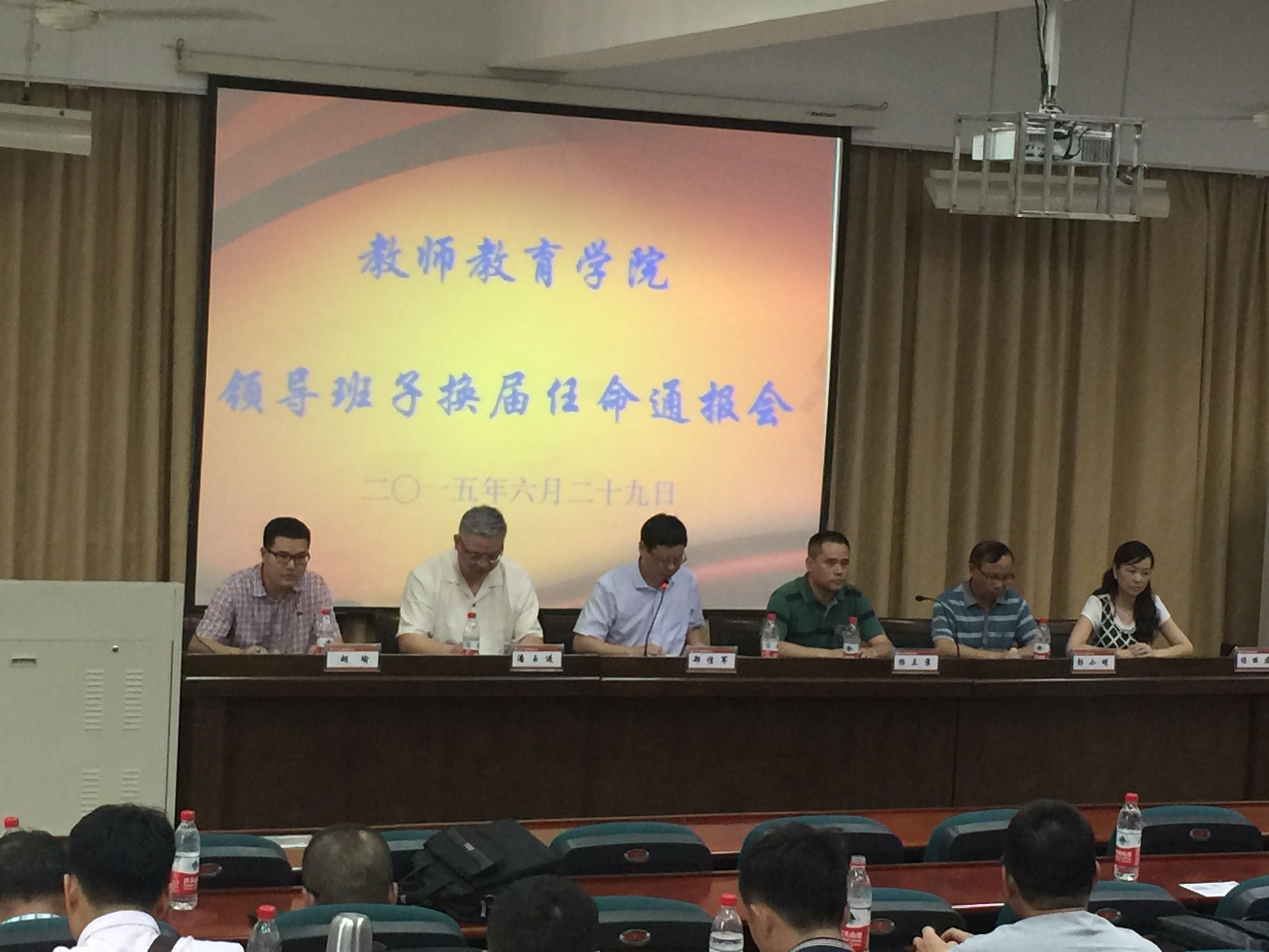 会议分两项议程。第一项议程是通报领导班子及科级干部的换届任命工作。郑信军院长向全院教师隆重介绍了新任91吃瓜 党总支书记杨立淮同志、党总支副书记杨丽君同志以及学生科副科长林萍同志,并宣读了学院领导班子新的分工。杨立淮书记、杨丽君副书记作了表态发言。