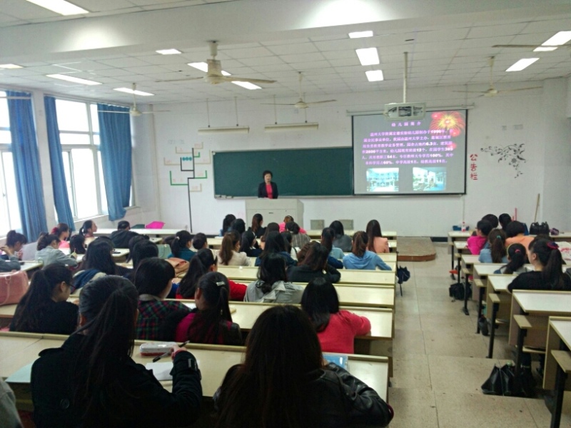 附属宏德实验幼儿园相关老师为学前毕业生开设就业指导讲座。讲座在教育楼301多媒体教室举行,宏德幼儿园陈娴、刘晓净两位老师分别就《灿烂人生 附幼起航》、《新教师如何考编》等主题展开交流。