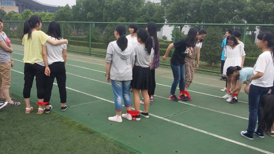 第三个运动项目是“两人三足”,由两个人团结协作,并排站立,用绳子捆绑住两个人各一只脚,互相配合进行接力。同组内身高差不多的同学们搭着肩,抓紧时间练习,口中不时传出“一二、一二”的口号声。比赛正式开始,林晓露同学和王诗雨同学将第一炮打响,飞快地跑到了对面。同学们也高度配合着,有条不紊地小跑到目的地。不知为何,曹红婷和李可可这两位“大长腿同学”却一路磕磕碰碰,绳子在他们的小腿上不停地拉扯着,坎坷地到达了目的地。