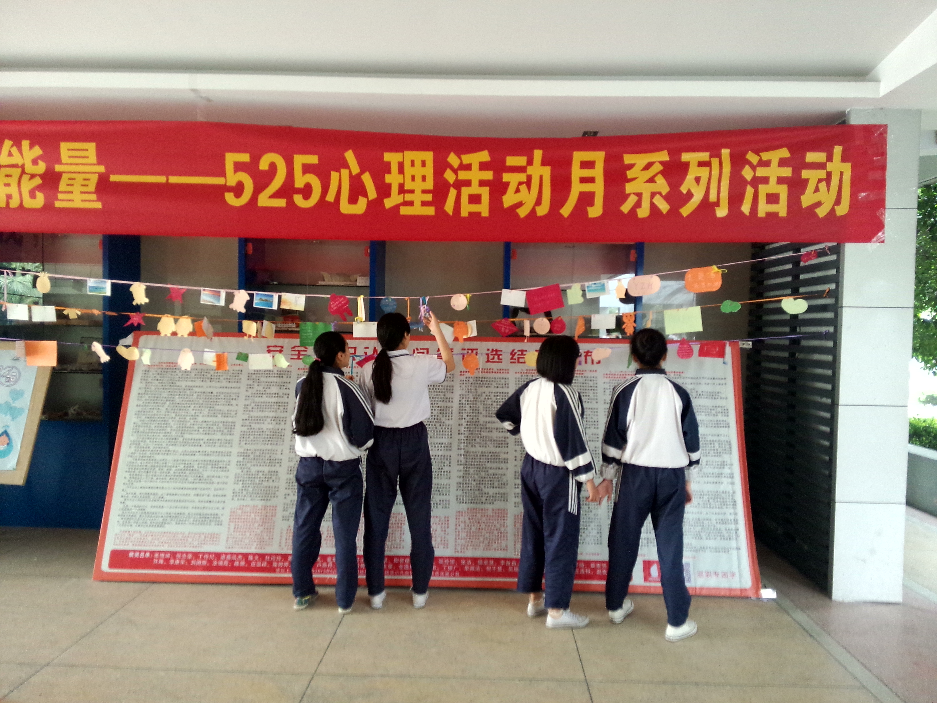 5.25当天,心灵家园便在教学楼一楼大厅布置了彩色丝带,并设置了“正能量加油站”为全校师生提供漂流瓶、卡纸、彩笔等物品。青春漂流瓶活动持续了一周,同学们都乐于参与,创意无限地将心愿卡纸裁剪成不同形状,让我们的活动现场乐趣不断。挂满了整个走道的漂流瓶和明信片,传递了同学们的许多美好心愿和祝福。