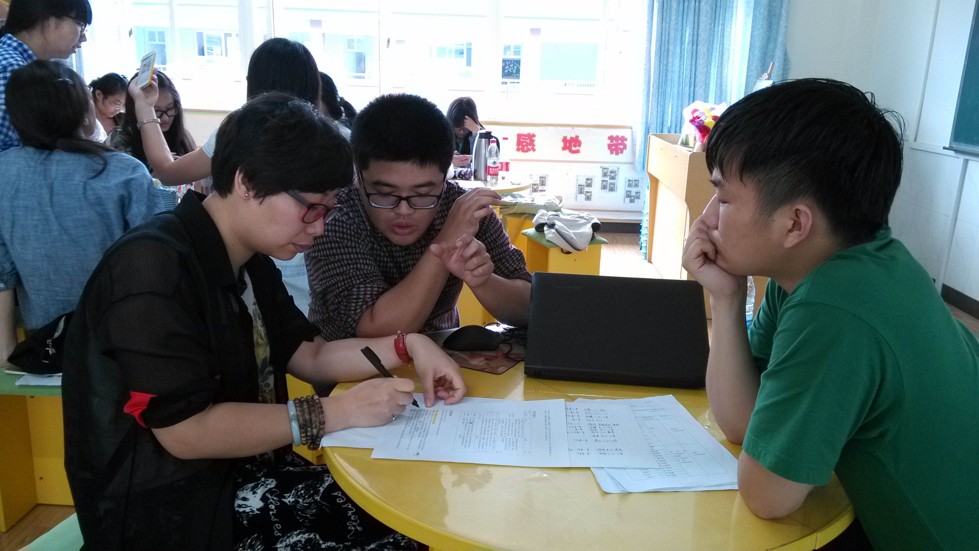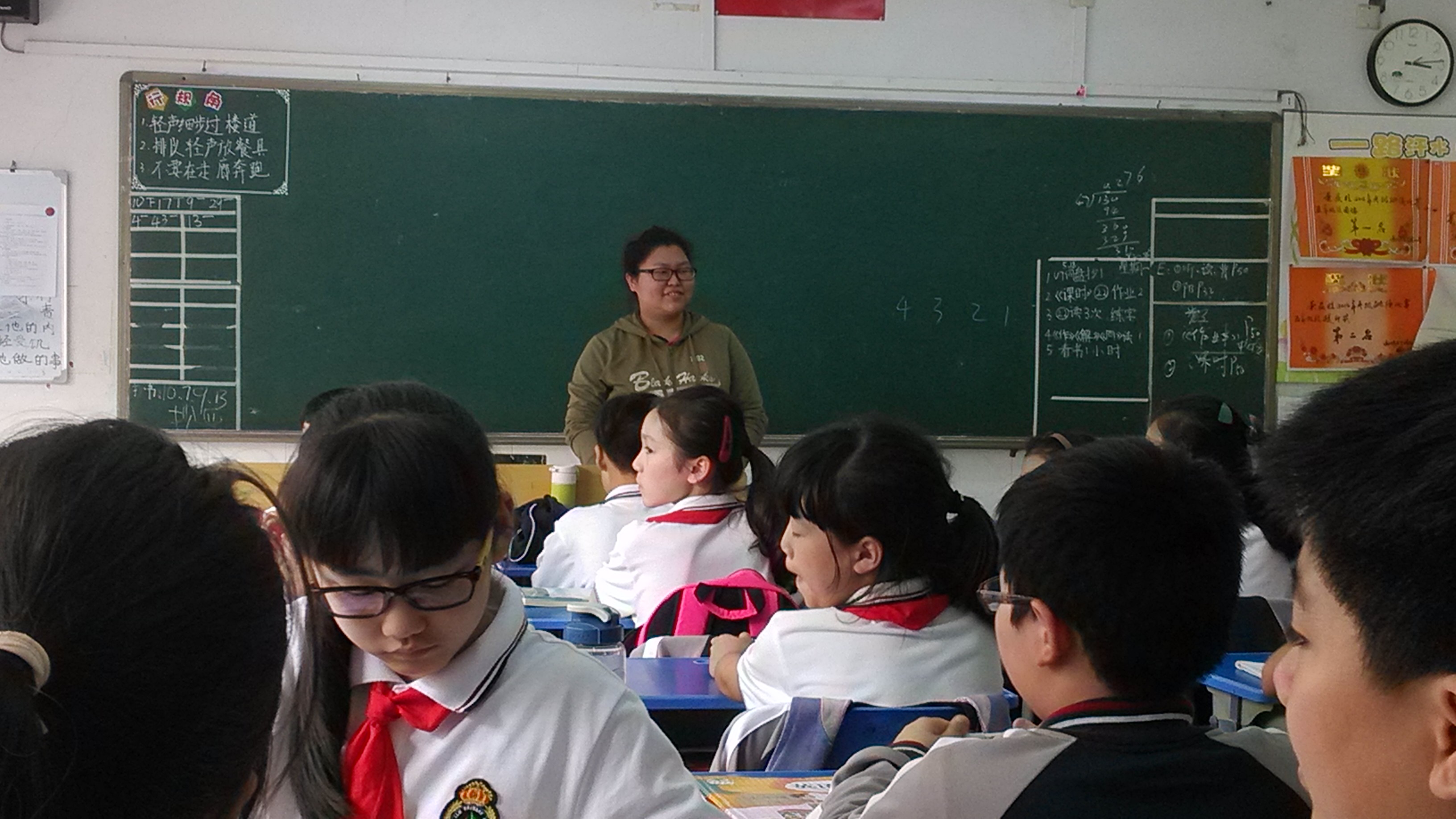 关于班级管理,我们基本上是照常不变的,而学妹们大概被安排为2人一个班级,主要是熟悉一下班级日常的管理过程,然后帮助老师改作业等等。当然,我们原来批改的作业的分量减少了一部分,同时心育室的布置和装饰也都交给了她们并在周五按时完成了。