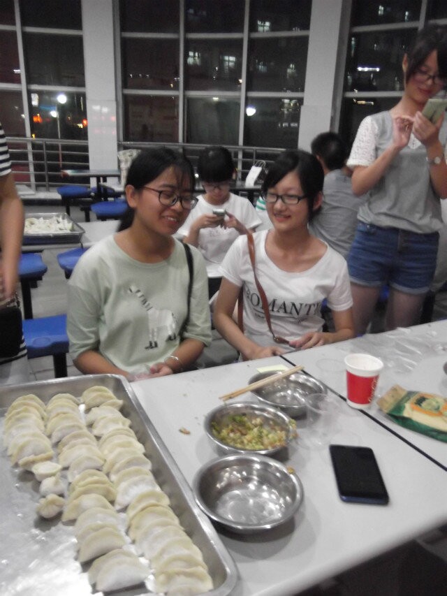 第二项活动是班委精心准备的包饺子比赛。全体同学自由结合,分成六个小组来包饺子。饺子皮和馅事先已经请食堂工作人员帮忙准备,同学们要做的就是DIY各具特色的饺子。女生们尤其活跃,纷纷包出了兔子形、元宝形、枣子馅等别致、喜庆的各色饺子。男生在班主任的提议下作为评委,评出了优胜的三个小组。最后食堂师傅帮忙煮好了饺子,班主任亲自掌勺,一人一碗,大家迅速地将数百个“战斗成果”消灭掉。之后,同学们在班委的组织下进行了竞猜和赛歌活动。