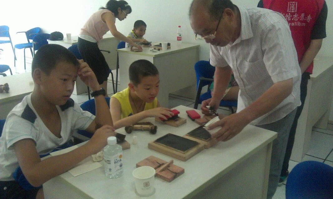 上午9:00,木活字印刷兴趣班正式开班。报名的小朋友们也陆续的来了,各自找到位子安静地坐下。之后,老师也到了,木活字印刷课正式开始。课上,老师要求志愿者分发材料,由于材料有限,两个小朋友为一组。第一节课,小朋友们先学印字,第二节课,小朋友们学刻字。课堂氛围十分活跃。