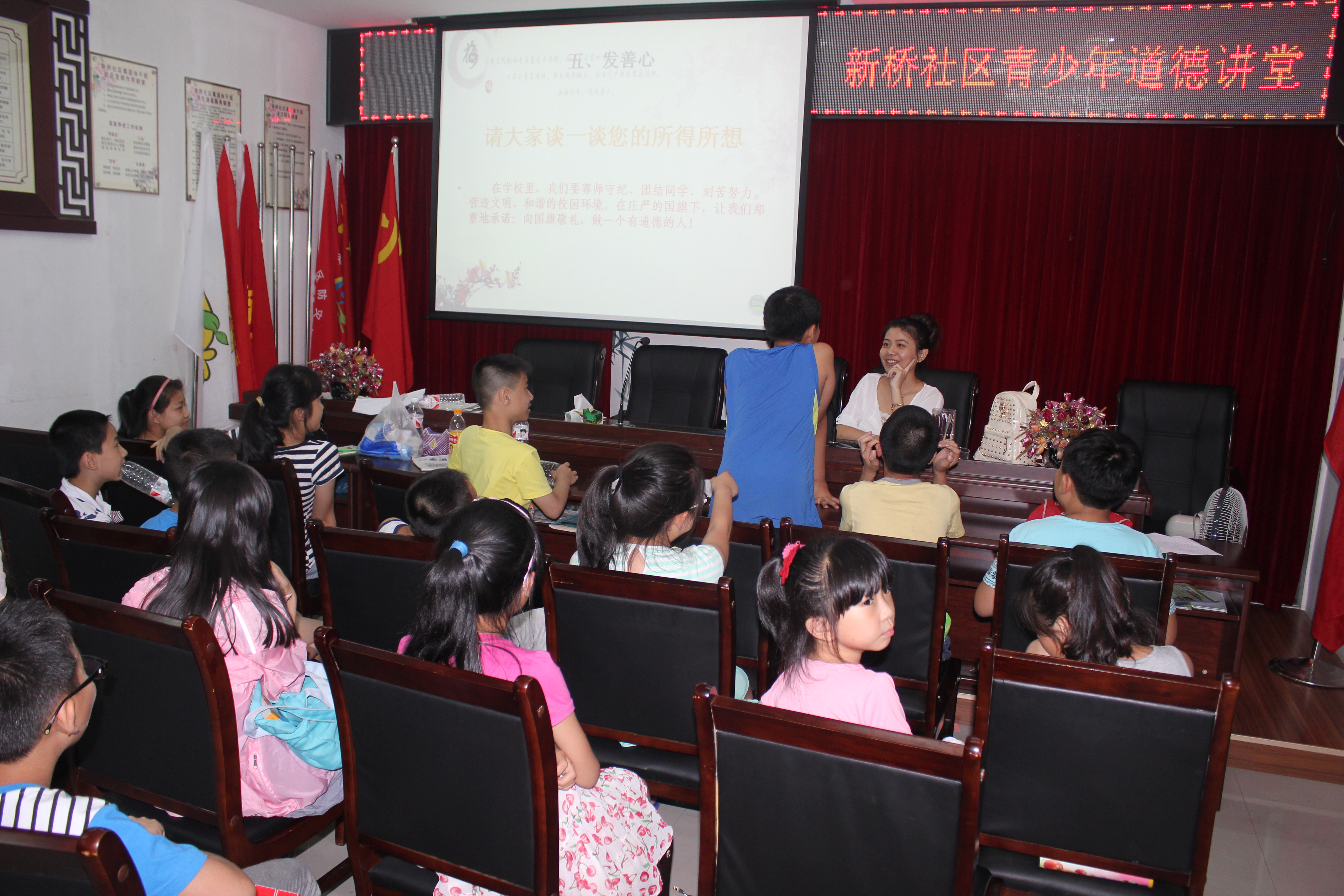 营员们在体验团体辅导后,在新桥社区体验第了四天的夏令营活动。活动以“扬国学,畅和谐”为主题,重点进行了“解决冲突”的团体辅导和国学大讲堂的教导与讲座。这次活动深化了同学们的国学精神以及和谐意识。让国学的“和为贵”精神,深入营员心中。