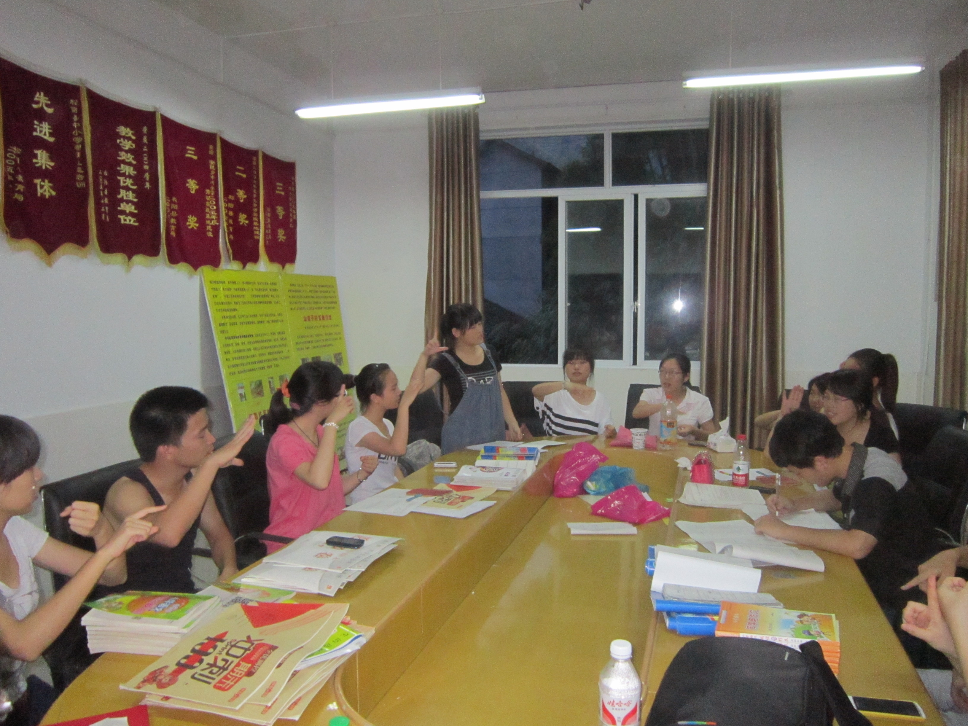 会议的第一项是重申关于汇报演出的事项,第一就是时间的问题,定于17或18号,最迟会在19号。第二就是节目表的问题,确定的节目有舞蹈,太极拳,大合唱,画展。画展是将学生的作品拿出来展出,基本上包括剪纸,折花,绘画,拼贴画等。到时会把作品放在演出场地的周围,好让家长们参观。会议的第二项议程就是确定实践队队员们所要表演的节目。因为考虑到节目的有趣性和多样性,也考虑到了队员自身的才艺问题。我们决定就现学现卖了,全体队员表演的是《北京东路的日子》手语版,女生们就表演前两天从乡民那里学来的广场舞。至于男生,可能会有街舞的表演。但是光是这样,好像节目不是很多。所以,队长向我们下达了一个命令,让我们集体全都陷入了一片愁云惨雾当中。那就是,我们每一个小组都要出一个节目(我们实践队分为调研组,活动组,通讯组和生活组)。经过组内各自的讨论,再上报一个节目。会议的最后一个环节是全体学习《北京东路的日子》的手语。由曹立晓教我们,我们一个字一个字的学,有些队员手很僵硬,看起来有点怪异。有些队员则学的又快又好。但是大家都很认真的学,碰到不会的也会马上问旁边的人。我们的曹老师对我们是非常的满意。