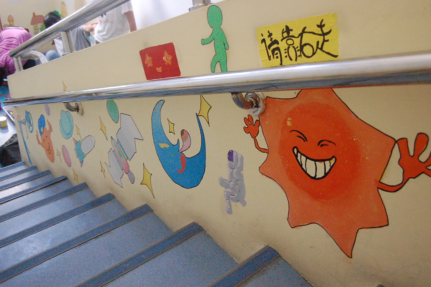 三天的奋战,我们终于将原本只是一种颜色的墙壁变得妙趣横生,还记得当时有一个孩子因为想看我们的墙壁画,偏要哭闹着从我们这个楼梯口经过,看到这个景象,我们也感到很开心,因为这意味我们的努力得到了孩子们的认可,我们感到三天的辛苦没有白费。有所付出必有所收获,我们今天最大的收获便是孩子们一张张纯真的笑脸和一句句童稚的赞美。最后完工的时候我们还出了一张海报,是关于接下来一周的支教活动的,当队员们一起将它贴在宣传栏里时,大家眼中的喜悦是溢于言表的。