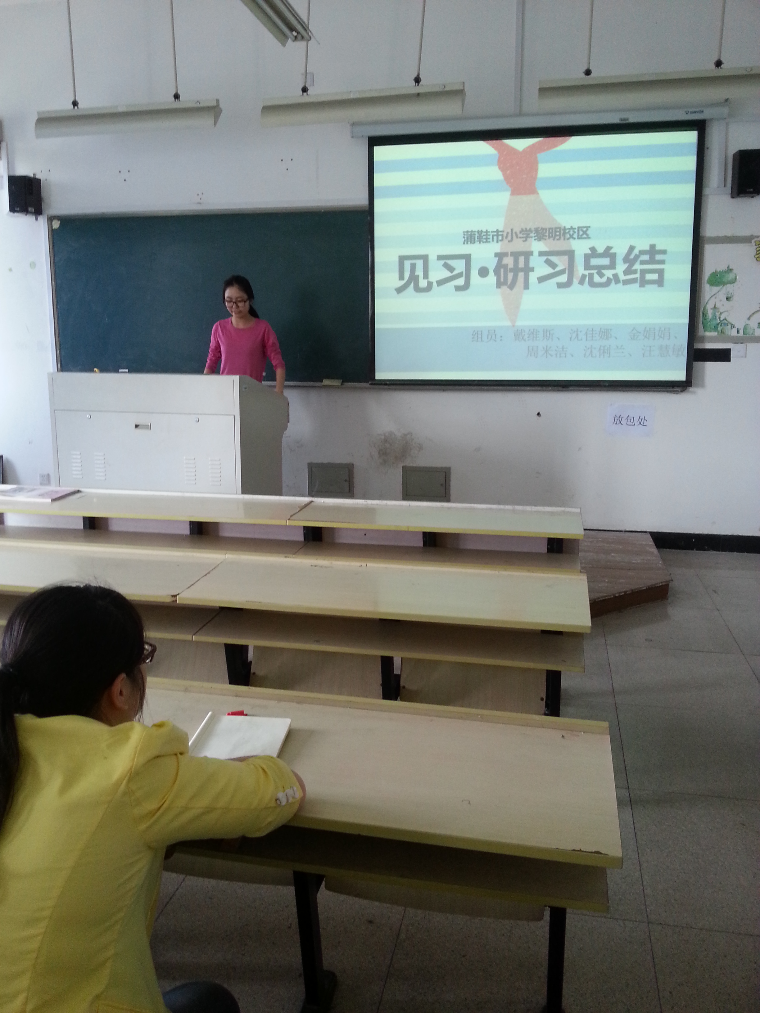 大会伊始,班长谢翔致辞,然后由各小组代表上台来展示小组成员此次见习的收获和感悟,有的小组口头叙述了见习的趣闻和轶事,有的小组提出了自己在见习中遇到的困惑和问题,有的小组讲述了自己的感受和收获。我们看着这一张张见习时留下的照片,听着每个小组的心得体会,仿佛我们每个人都去到这几所小学,感受到他们的氛围似的。所有小组展示完毕之后,班级同学之间展开交流总结,讨论过程相当地热烈。最后由班主任朱伟老师总结发言。