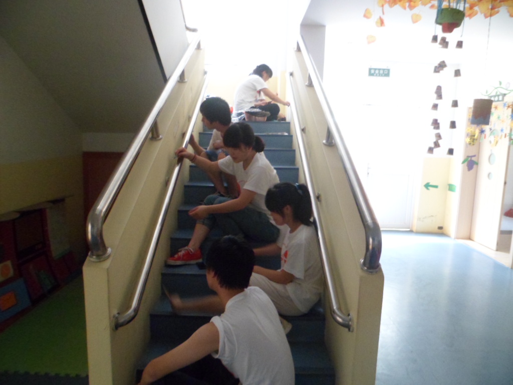 中午有一段的休息时间,我们就聚在一起讨论下午的工作。在我们与幼儿园的协商下,他们同意我们参观孩子在幼儿园的学习环境,我们也可以顺便学习一下幼儿园老师的教学经验。孩子的笑容让我们又充满了动力。下午一点,队员们就又准时投入紧张的工作中,尽管腰酸背痛大家还是坚持了下来。在工作中我们还可以听到孩子们的歌声,伴随着他们的节拍我们也跟着小声地哼唱起来。