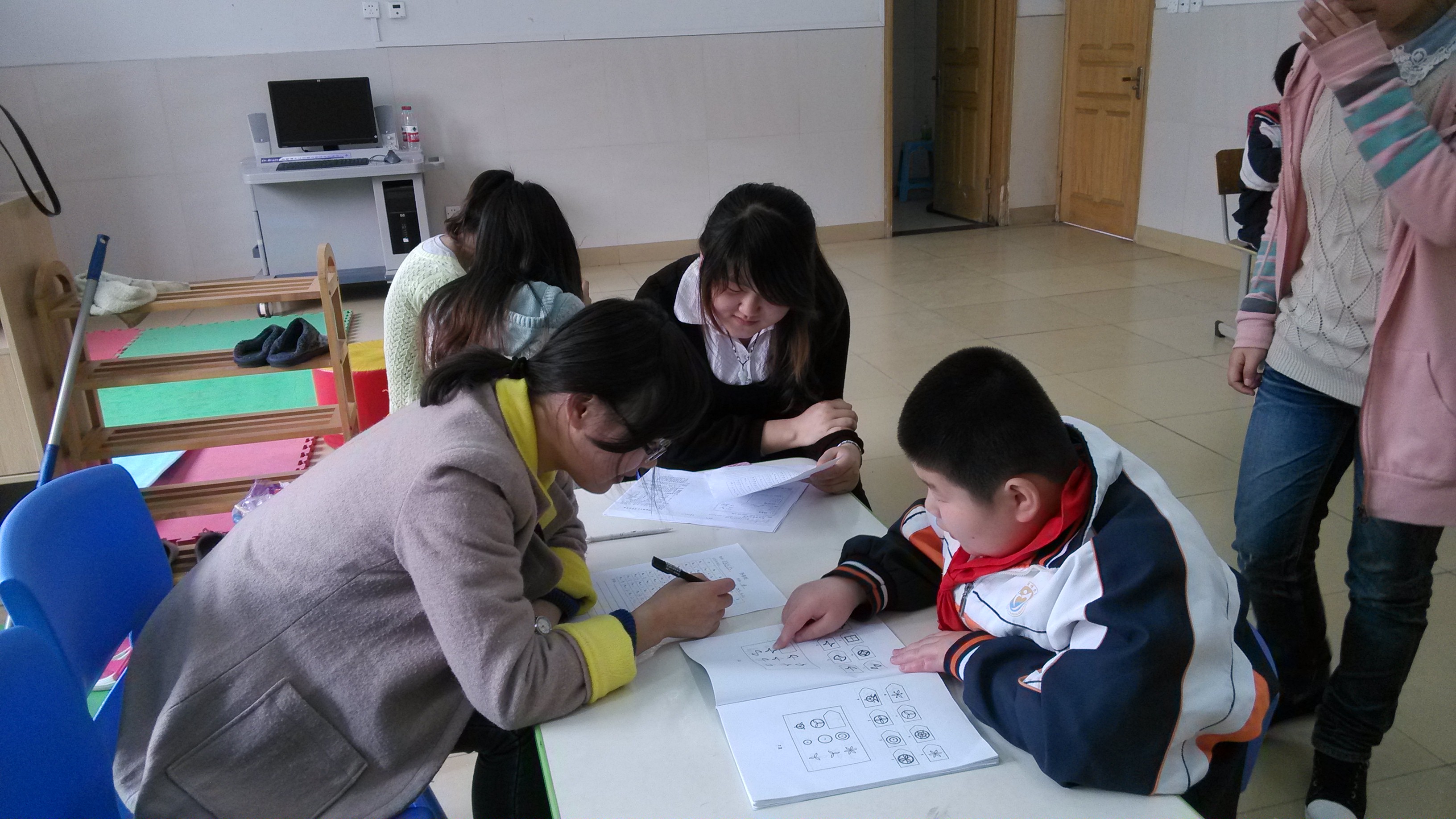 这次我们主要对自闭症儿童进行了互动交流,这些被称为“来自星星的孩子们”,与普通孩子相比明显有着社交障碍、语言障碍 、行为刻板等特点。例如,活动中,我们发现有一孩子如何问他,他都没有回应,反复地拆卸手上的那支笔,拆了后又装回竟达三十余次,似乎永不厌烦,可见自闭症状相当严重,因而都无法让他配合我们进行心理测量活动。在同孩子接触时,真的发现很难对他们进行安抚工作。所幸的是在观看老师对其训练时,我们学到不少克服他们刻板行为的小技巧,从而减少彼此之间的交流障碍。