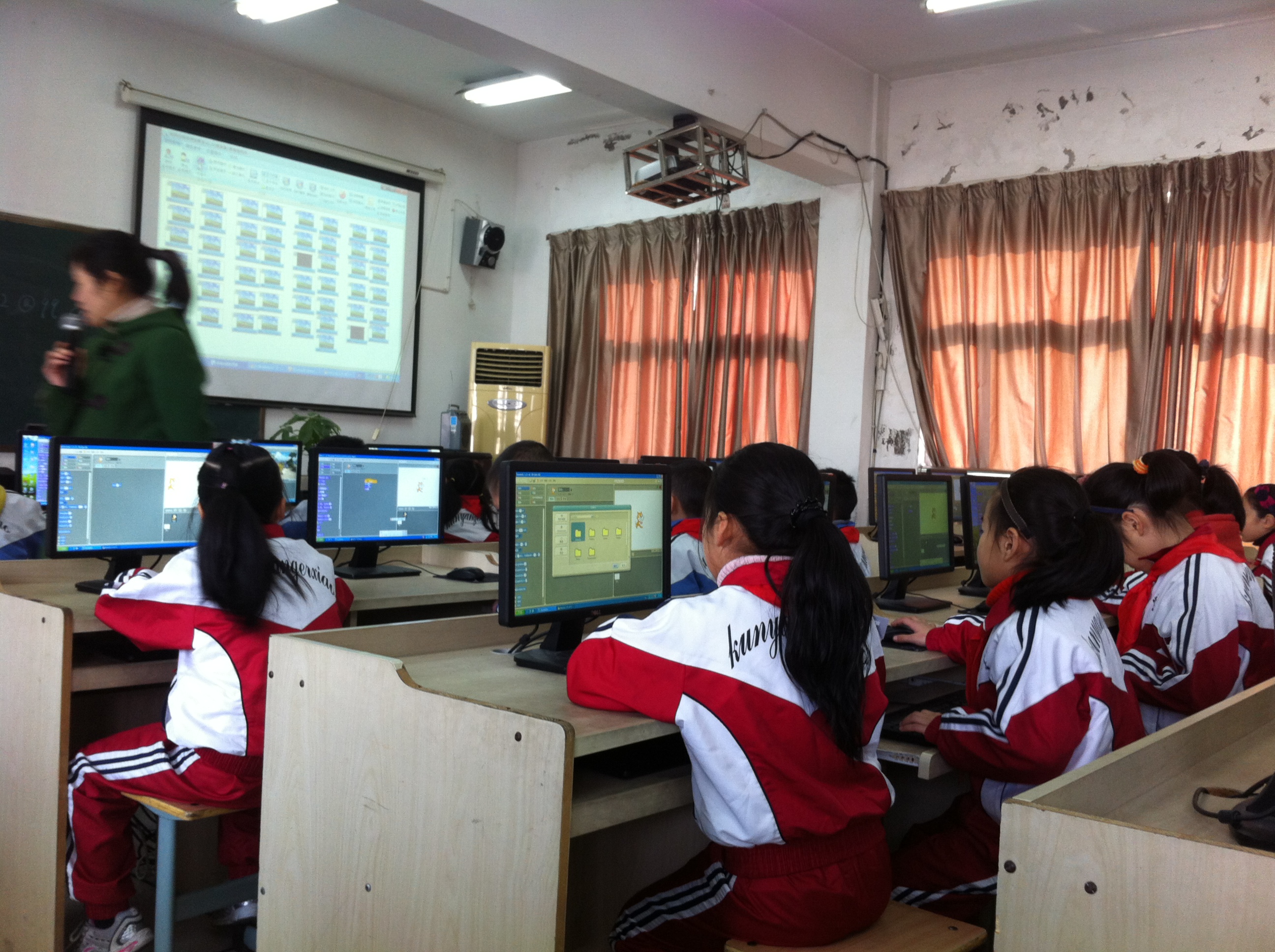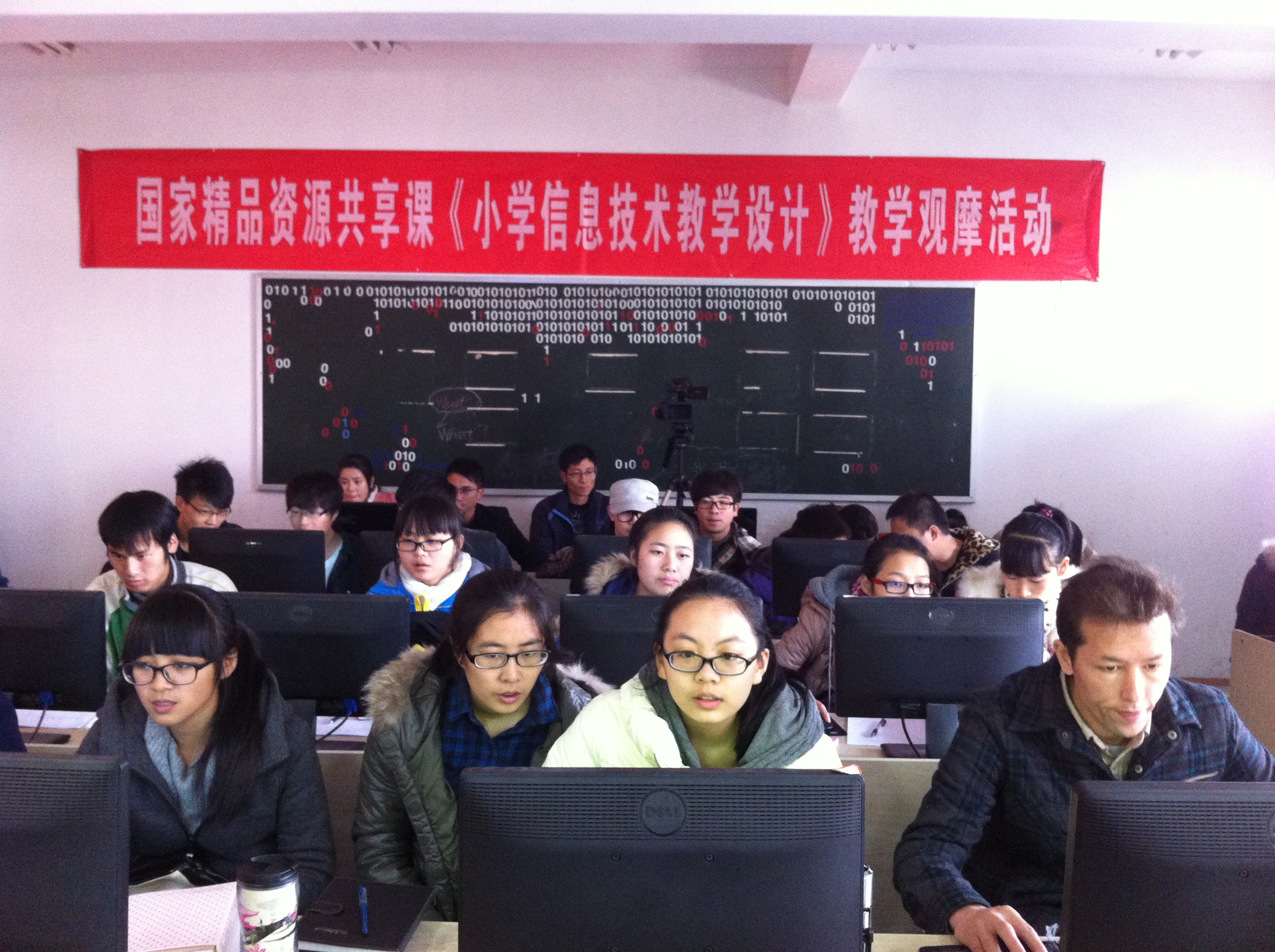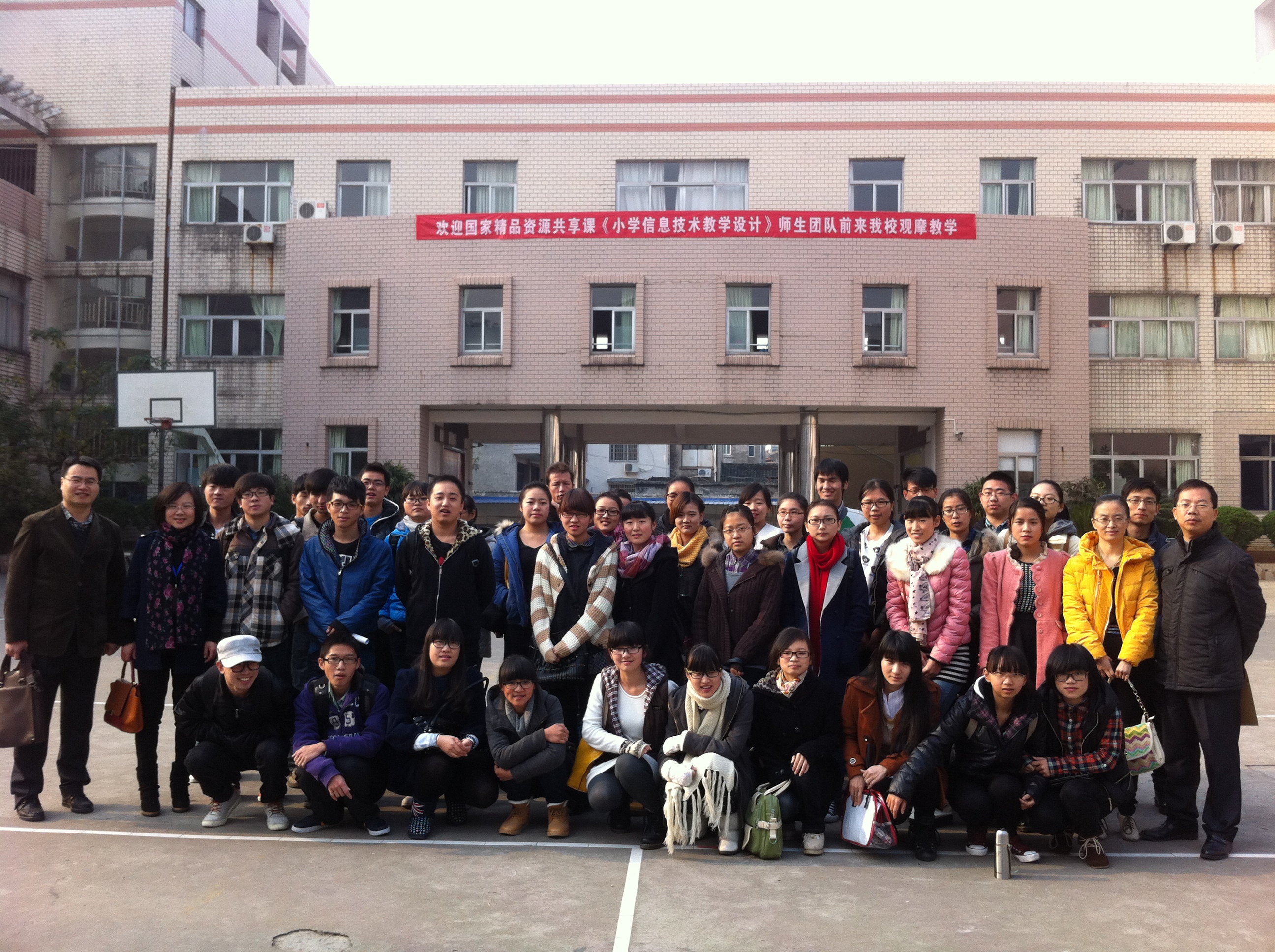 一个小时后,全体师生安全到达昆阳二小门口。谢贤晓老师早已等候在校门口迎接大家的到来。一进校门,所有人就看到主教学楼上高高挂着的横幅——“欢迎国家精品资源共享课《小学信息技术教学设计》师生团队前来我校观摩教学”,自豪感便油然而生,同时大家也对东道主学校的用心深感愉悦。九点半,第一堂信息技术课开始了,本次的课堂是根据谢贤晓老师提出的“同课异构”展开的,即上午两节课为同一个主题与内容,但是由两位颇具经验的教师来授课,以此突出不同的教学活动设计带来的差异。