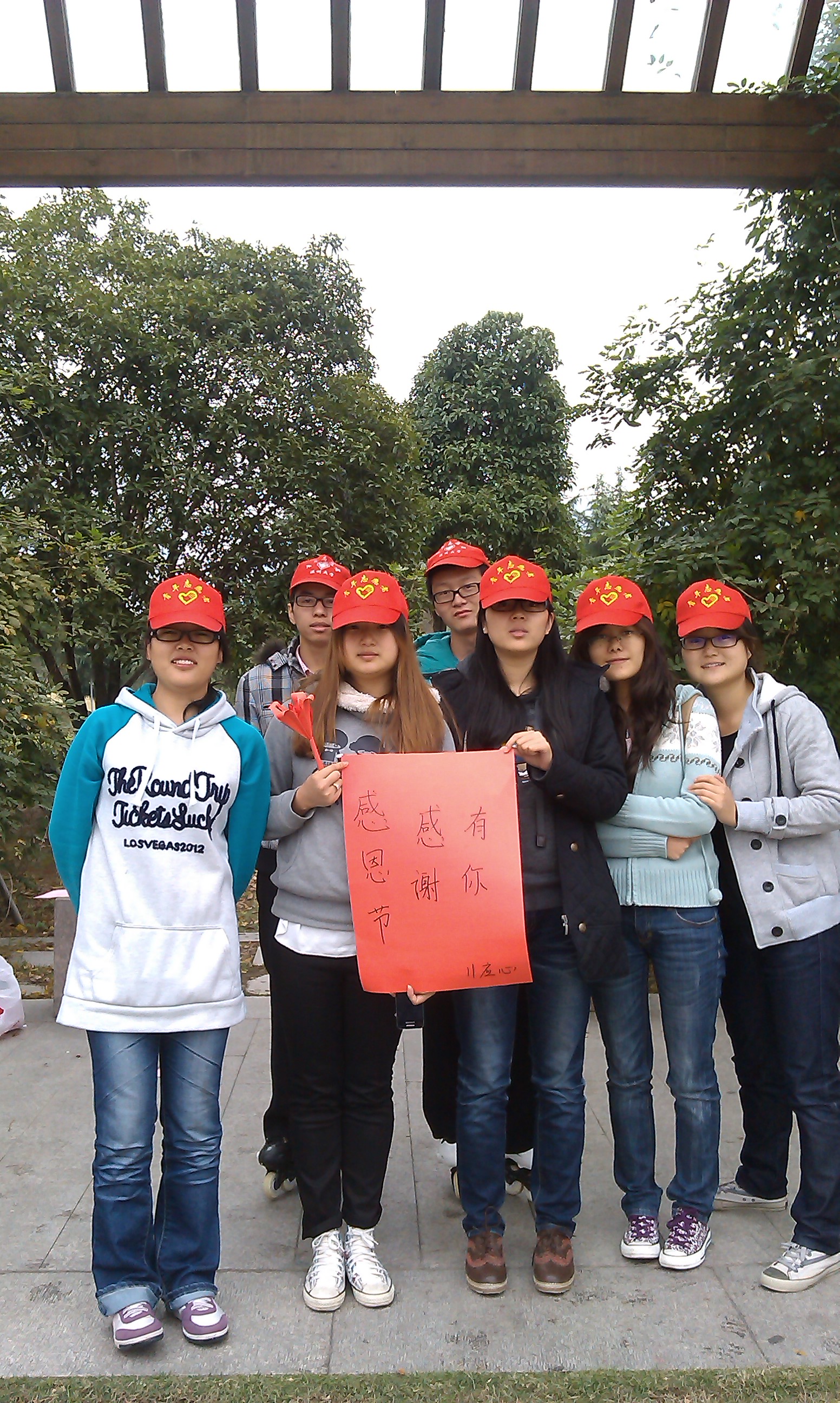 2012年11月24日,11应心班的八名志愿者聚集在学子广场长廊,折各色的千纸鹤、百合花还有心,并把我们的成果也是心意送给路人,让大家在感恩节里收获祝福。