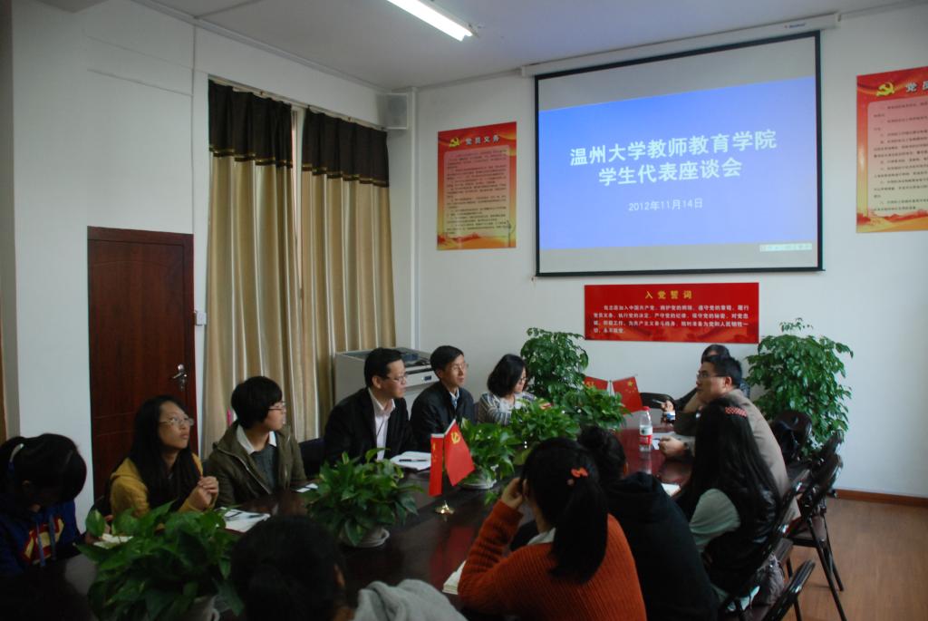 党员之家召开。蔡联群书记、小教系主任蔡志凌老师、教技系刘根萍老师应邀出席会议,小教系、教技系大二、大三年级各班学生代表参加了会议。同学们就党员发展工作、就业考研辅导、学区工作、寝室导师制、贫困生工作等大家较为关心的问题进行了集中反映。蔡联群书记与同学们亲切交流,各系老师也针对同学们提出的有关本专业的相关问题进行了详细的解答。