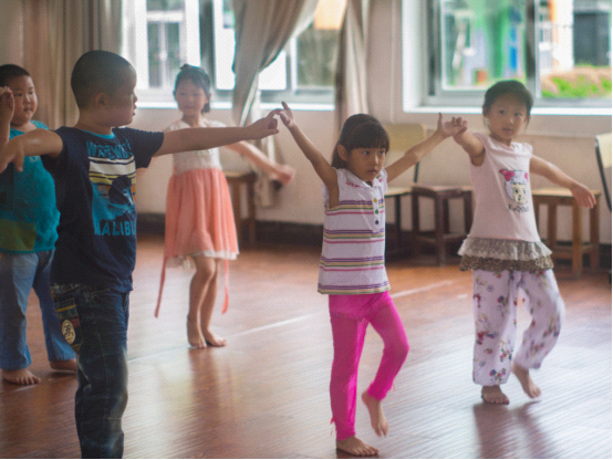 时间定位在上午8点,镜头聚焦在快乐提高班的《左手右手》舞蹈课。这个小小的班级只有6个孩子,可是他们的舞蹈却是大大的出彩。在之前的课上,孩子们先是欣赏了一段美妙的舞蹈视频,活泼灵巧的舞姿如同一颗投河的石头,在孩子们的心畔泛起不绝的涟漪,引得他们拍手称赞,表现出对这段舞蹈的极大兴趣。在随后的练习课中,老师趁热打铁地让孩子们站起来排列整齐,一个动作一个动作地带领孩子们步入舞蹈的快乐世界。“当困难来临的时候,请你举起你的左手,左手代表着希望,它不会向困难低头……”孩子们一边跳,一边跟着音乐哼唱,不住地说“我太喜欢这首歌啦!”“好好听啊!”几个乖巧的女孩子对舞蹈天生具有某种优势,学得特别快,已经不用再模仿老师的舞姿;可那几个不太能记住动作的孩子呀,立刻感到自己的落后,皱着眉头更加用心听老师讲授要领。经过几节课的认真练习,孩子们已经能熟练地伸出他们的小手随着旋律舞动,真诚的笑意洋溢在他们的脸上,跃动的脚尖充满了活力,可爱的音符从他们的嘴边跳出,天真的快乐在他们的指尖流转……