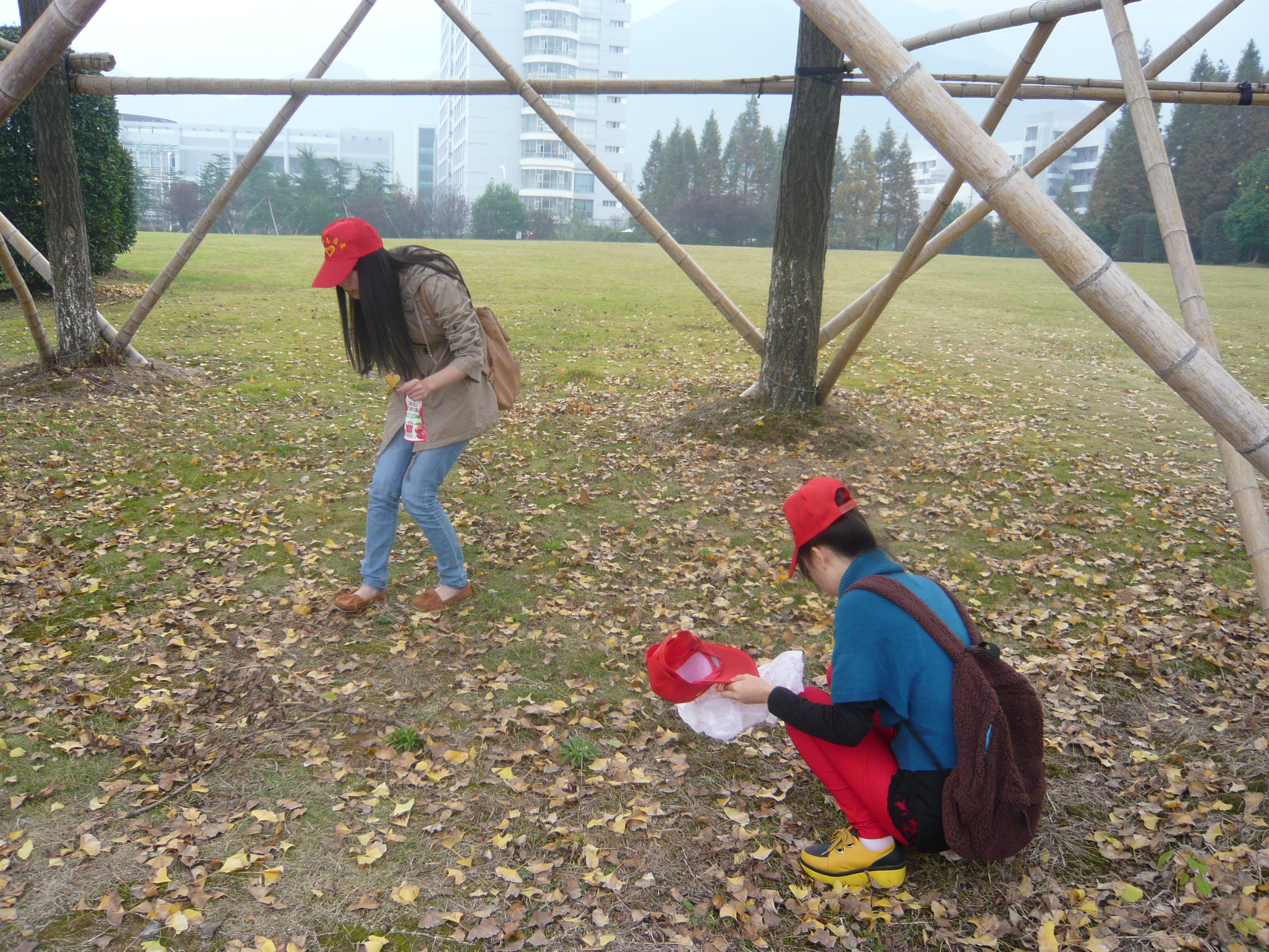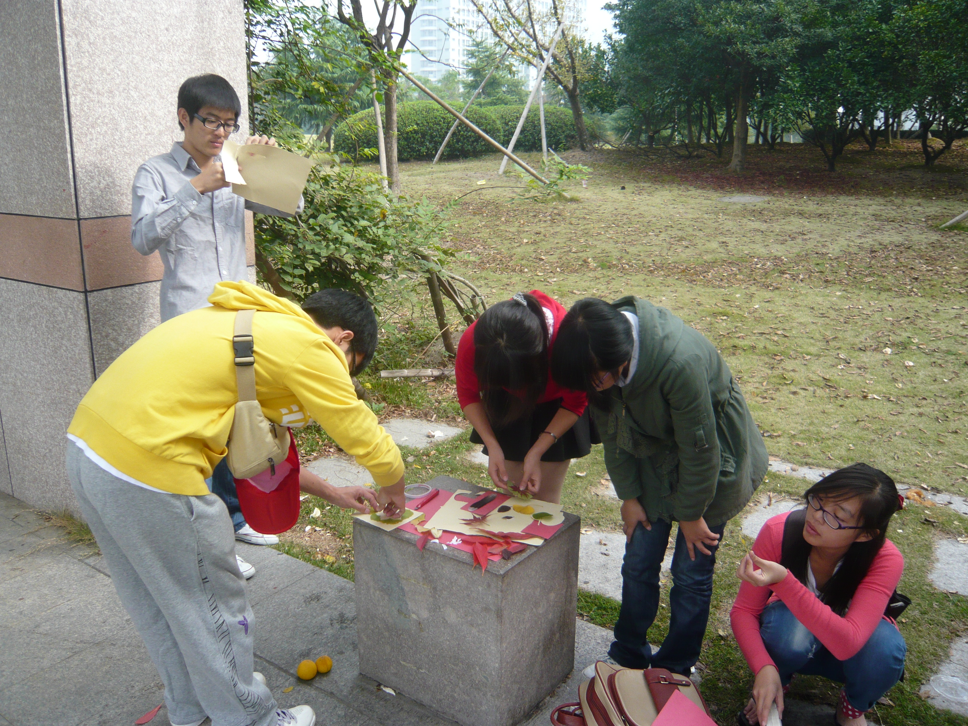 早上8点30分,志愿者们在学子广场上集合。简单的活动内容说明后,20个戴着志愿者帽子的身影出现在学子广场上的各个角落。每个同学都擦亮了眼睛,在草地上寻找着完整且有特点的树叶。“哇!这片叶子真好看。”“这里的树叶是爱心型的!”、“这边!这边的叶子都很完整”。草地上不断出现同学们互相交流的诸如此类的声音。经过将近一个小时的寻觅,同学们都满载而归,来到约定的学子长廊集中。树叶采集的工作已经完成,接下来就是本次活动的重点——制作书签。以3人为一小组,志愿者们被分成了6组。每组都领到了硬卡纸、剪刀、小刀、双面胶、彩带等工具,制作环节就这样正式展开了。虽然已经是小大人了,没有了像孩子那般天马行空的创意,但我们未来人民教师的创意也是不容小觑的。爱心形的卡纸,配以爱心形的小树叶,很是友爱;常规的长方形卡纸,加上树叶的创意摆放,显得很有特色;书本形的、蘑菇形的、镂空的书签配以同学们真诚的祝愿语。这些都装满了我们对小朋友们浓浓的祝福。