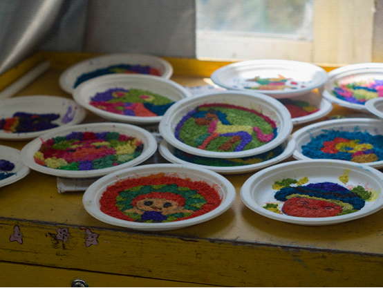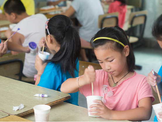 快乐二班的手工课可谓丰富多彩,做纸玫瑰,剪囍字,折千纸鹤、燕子飞机、小猫,瓶贴画,纸浆画。因为快乐二班是中年级,班里不少男孩都很吵闹。为了维持秩序,发扬合作精神,老师们把大家分成四个小组,每个小组6个人。每个小组有一包纸巾,一盒颜料,两个颜料盘,每个营员都可以拿到一个纸杯,一支画笔、一个纸盘画和两根牙签。看到这些材料,你是不是开始好奇这究竟是如何的画画过程了。