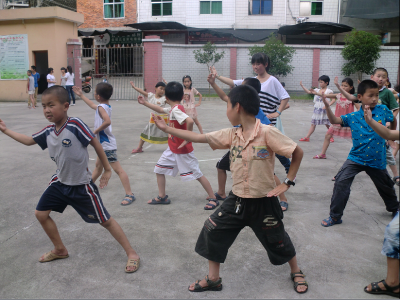 叮铃铃,叮铃铃,上课的铃声响起来了,两个美丽的小老师踏着自信的步伐走进教室,在组织学生排好队后,一前一后的领着学生走向操场。尽管我们的学校建在山脚下,又是四面环山,但是仍然抵挡不住炎炎烈日的炙烤,滚烫的地面不断地往上冒着热气。学生一共分为四列,一个老师在前面讲解演示,另外一个在下面纠正指导学生的动作,双剑合璧合作无间。今天的上课内容,主要是二十四式太极拳的前两节——起势和左右野马分鬃。可能同学们之前没有接触过太极拳,大家学的速度有点慢。对于这帮孩子来说,要打好太极拳确实有点难, 所以我们的小老师尽量把动作分解开,先教脚步动作,再配上手势,重复了一遍又一遍,直至学生学会了为止。看着有些同学由于没有掌握要领,小小的身子东倒西歪的样子,真真是可爱至极。也有一些同学很聪明,抬手,提脚,依葫芦画瓢一气呵成,尽管动作还略显稚气,但已经有那么点架势了,想必再过不久他们就会有所收获。