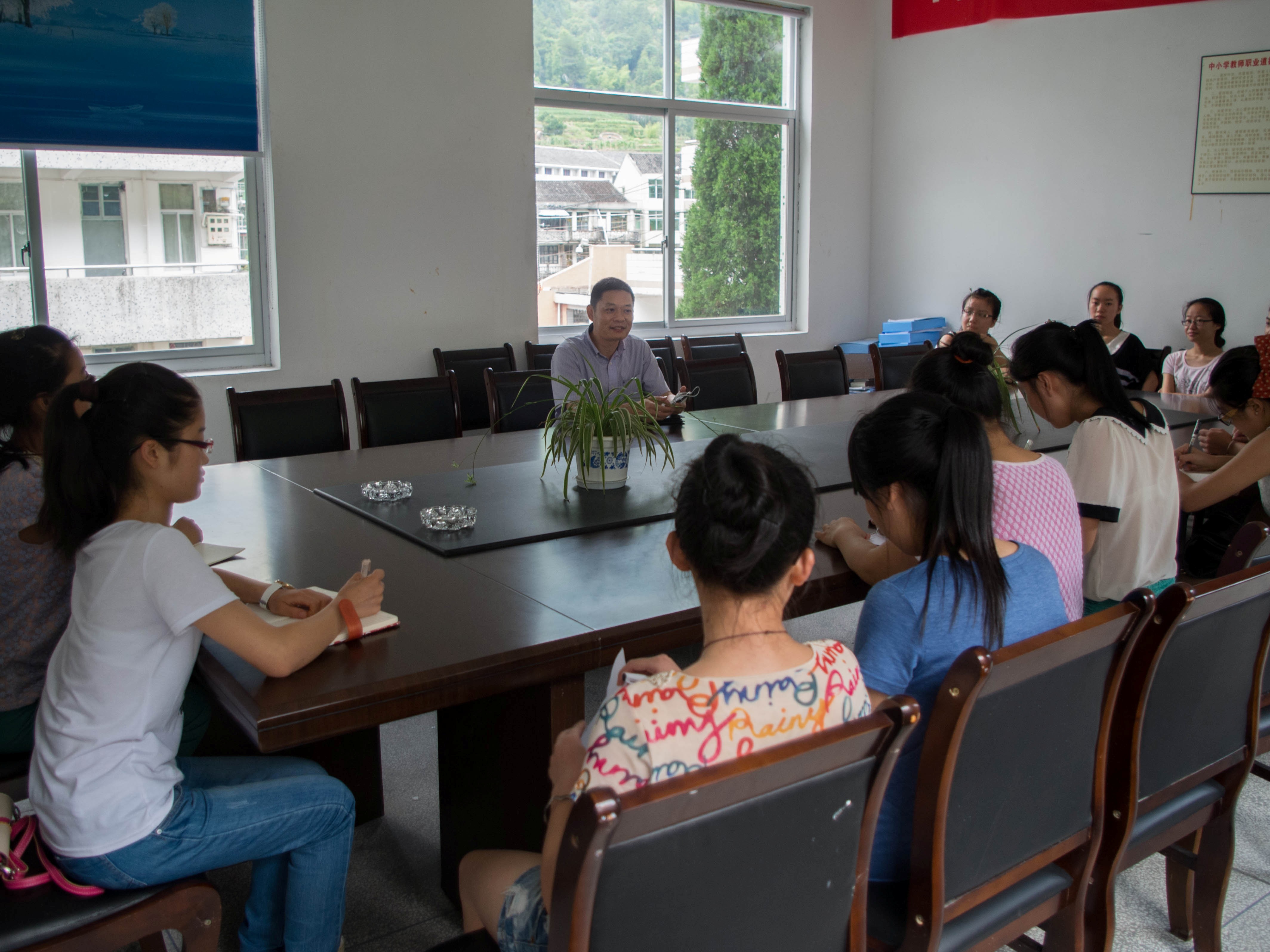 下午比赛结束后,我们队伍的指导老师蔡志凌老师也来看望大家。在二楼会议室,蔡老师向我们了解了最近的情况以及实践中遇到的问题。枫岭依山傍水,地处偏僻,所以师资相对落后与薄弱。蔡老师希望我们把自己的教学理念与活力的教学方式带给这里的孩子们,让这块“中华文化传承基地”既带给孩子们知识与快乐,也带给我们自己一份难能可贵的锻炼,对自己的专业有一个初步的感性认识。这将是我们职业规划上收获的第一桶金!