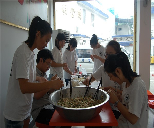 约用了两个小时,队员们包出500个饺子。在食堂大爷的指导下,男生们把煮熟了的饺子装进大食桶抬上楼,女生们则拿着大勺给孩子们添满饺子。当孩子们大快朵颐时,队员们皆站在一旁,没有动一个饺子。