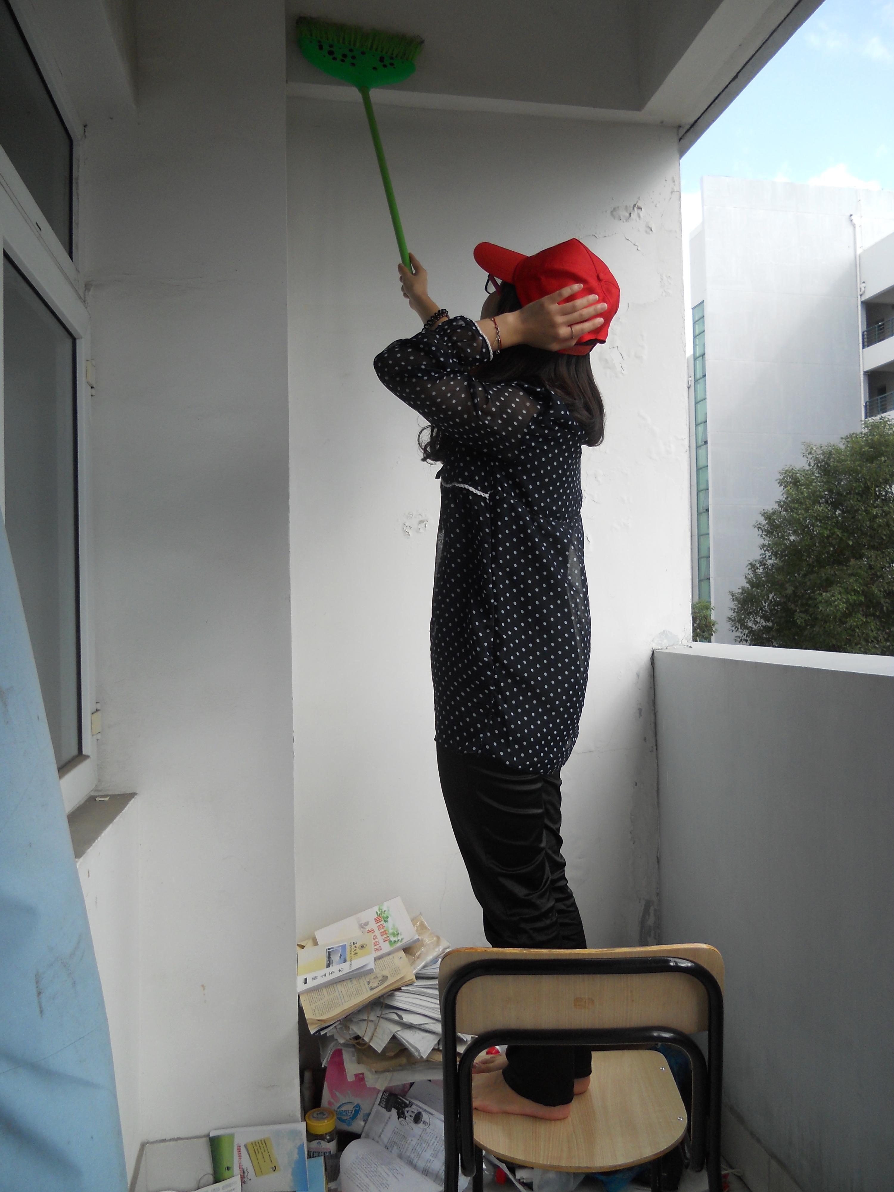 入秋之后,寝室里的蚊子、蜘蛛等动物渐渐地不见了踪影,但它们的痕迹却仍然存在——墙角凌乱的蜘蛛网。为了保持寝室的卫生,为了保证大家的居住环境,我们拿着各个寝室的扫把,踩着凳子,艰难地够着各个寝室天花板上的蜘蛛网。