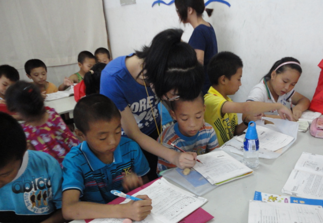 简单的见面交流会之后,“知心姐姐”实践队的小老师们开始辅导孩子们做暑假作业。孩子们纷纷拿出各自的作业,语文、数学、英语等一应俱全。在老师的安排下,孩子们纷纷开始安静地写起了自己的作业。其中有年龄较小的孩子在练字,却不清楚字的笔画,队员许梦霞耐心地握着孩子的手,一笔一划地引导孩子写完了这些字。在指导孩子有针对性地抄写几遍之后,这个孩子最终顺利地学会了这些个字的规范写法。
