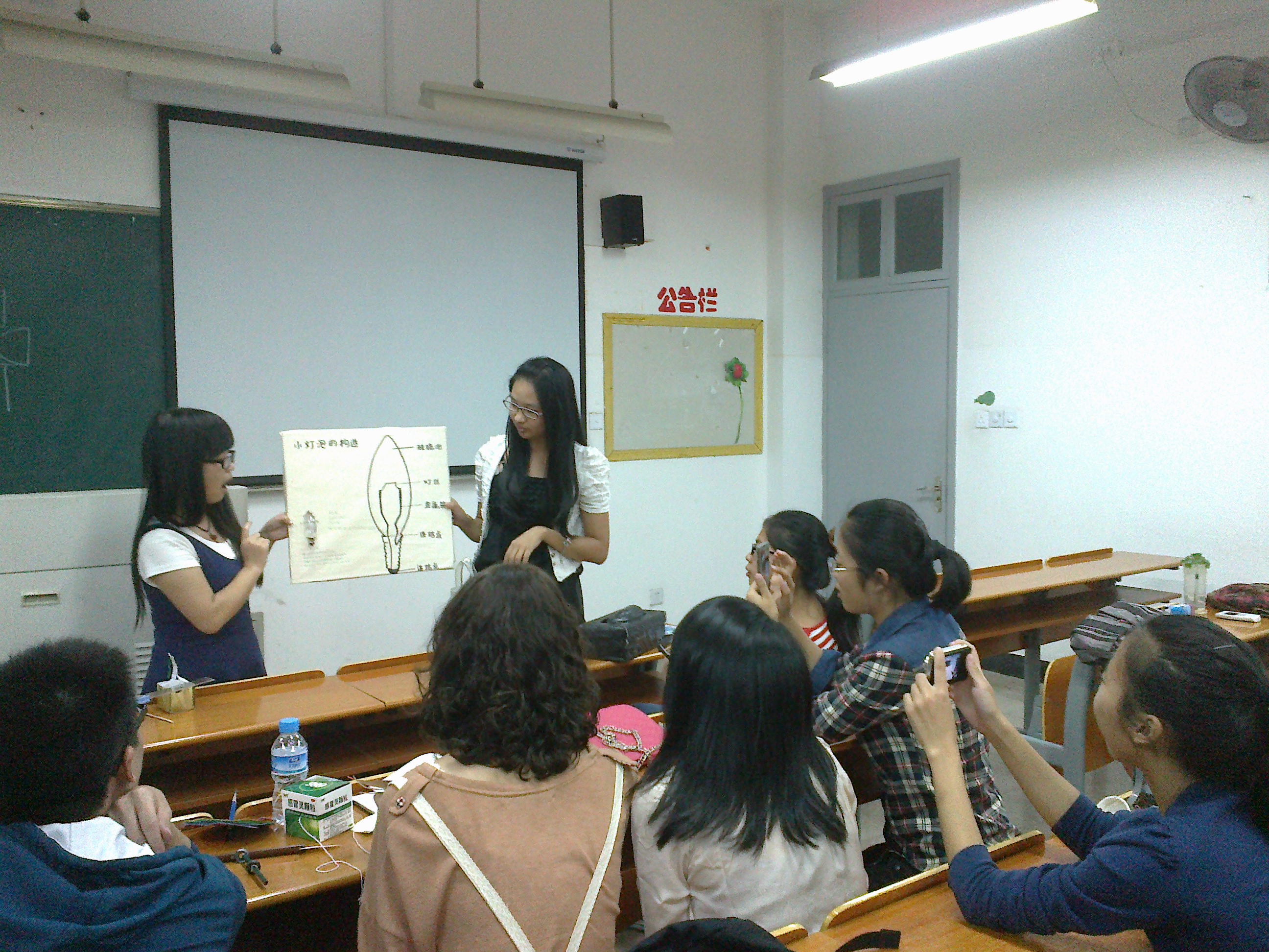 活动共分三模块,学习委员金鑫同学对比赛的要求与规则做了简要说明,后由每组派代表到台前展示自己亲手制作的教具,并对制作科学原理,所配合的教学环节等内容进行详细介绍。其中有构思巧妙的“黑匣子”;有制作精美的“小灯泡结构分解”;更有实用美观的“风向标”等等,共有10件作品参与评比。一件件作品使得同学最后经过激烈的投票,共选出金银铜三奖各一件。