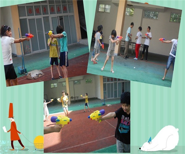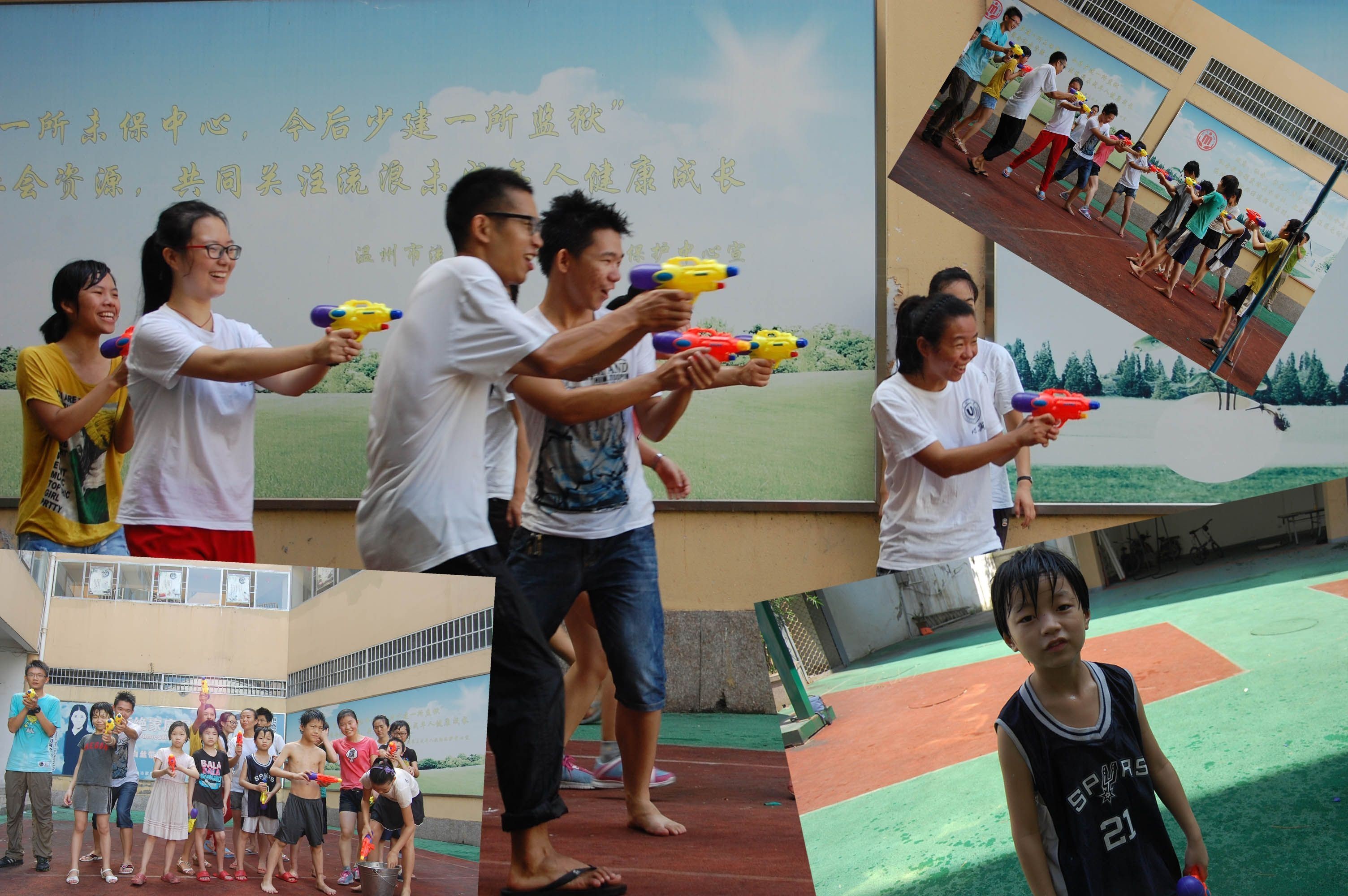 刚开始,队员和孩子们根据抽签分为两组。为了把“敌方”打败,两个组的成员都卯足了劲,各种战术齐上阵。大家的热情持续高涨,玩到最后,都丢开了规则,见人就举枪喷射。泼水活动受到了大家的一致欢迎,虽然人人都成了落汤鸡,但欢乐的氛围没有受到丝毫影响。
