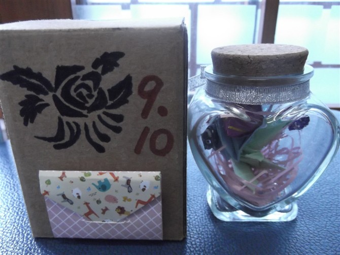 10小教中文的新班委们在学期初就讨论起“什么礼物最贴老师的心”。折纸花吧,这个创意去年用过,一朵朵精美的百合和郁金香至今还插在老师们的案头;送盆景吧,很清新,还能降低电脑辐射,可是别的班级已经抢先准备了。最后,班委们决定送老师许愿瓶,里面装上同学们亲手折的五色星星和千纸鹤。