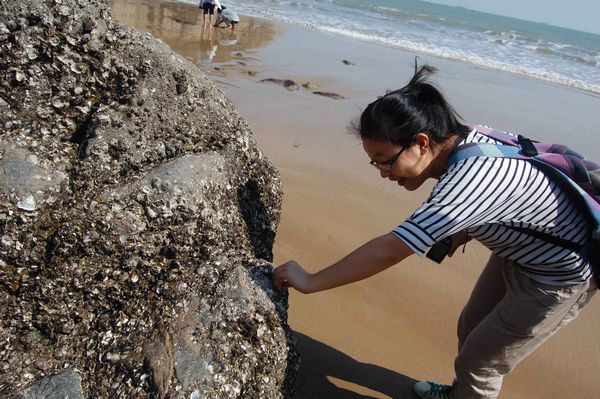 抵达洞头以后,同学们来到大沙岙,分组在附近的礁石上进行潮间带生物多样性的考察,并带回一些形状各异的小贝壳,以待进一步的科学研究。同时考察了海湾的羊栖菜养殖,培养区和养殖区呈现不同的形状和色泽;并认真观察了渔民正在从事的种植作业。