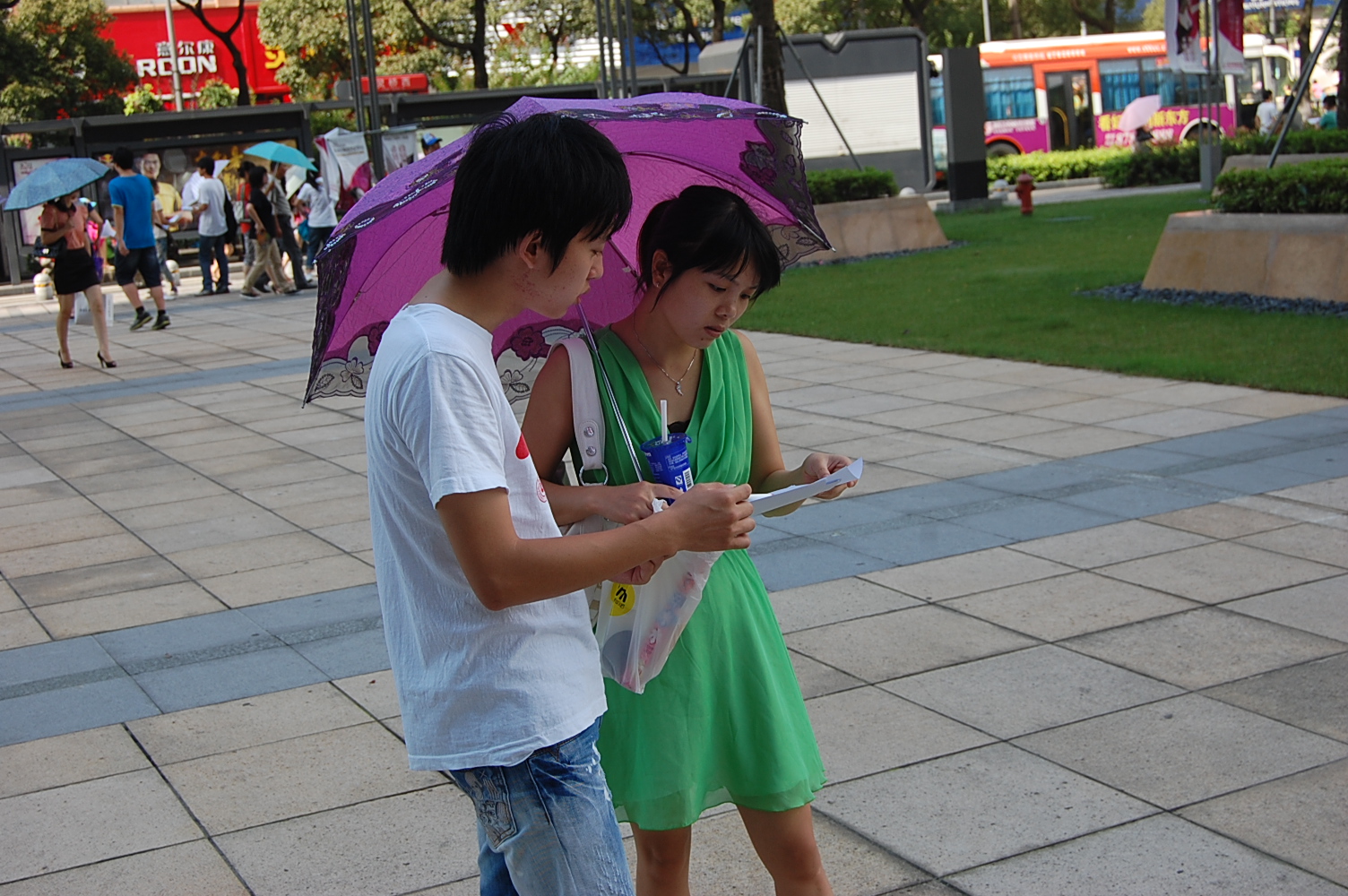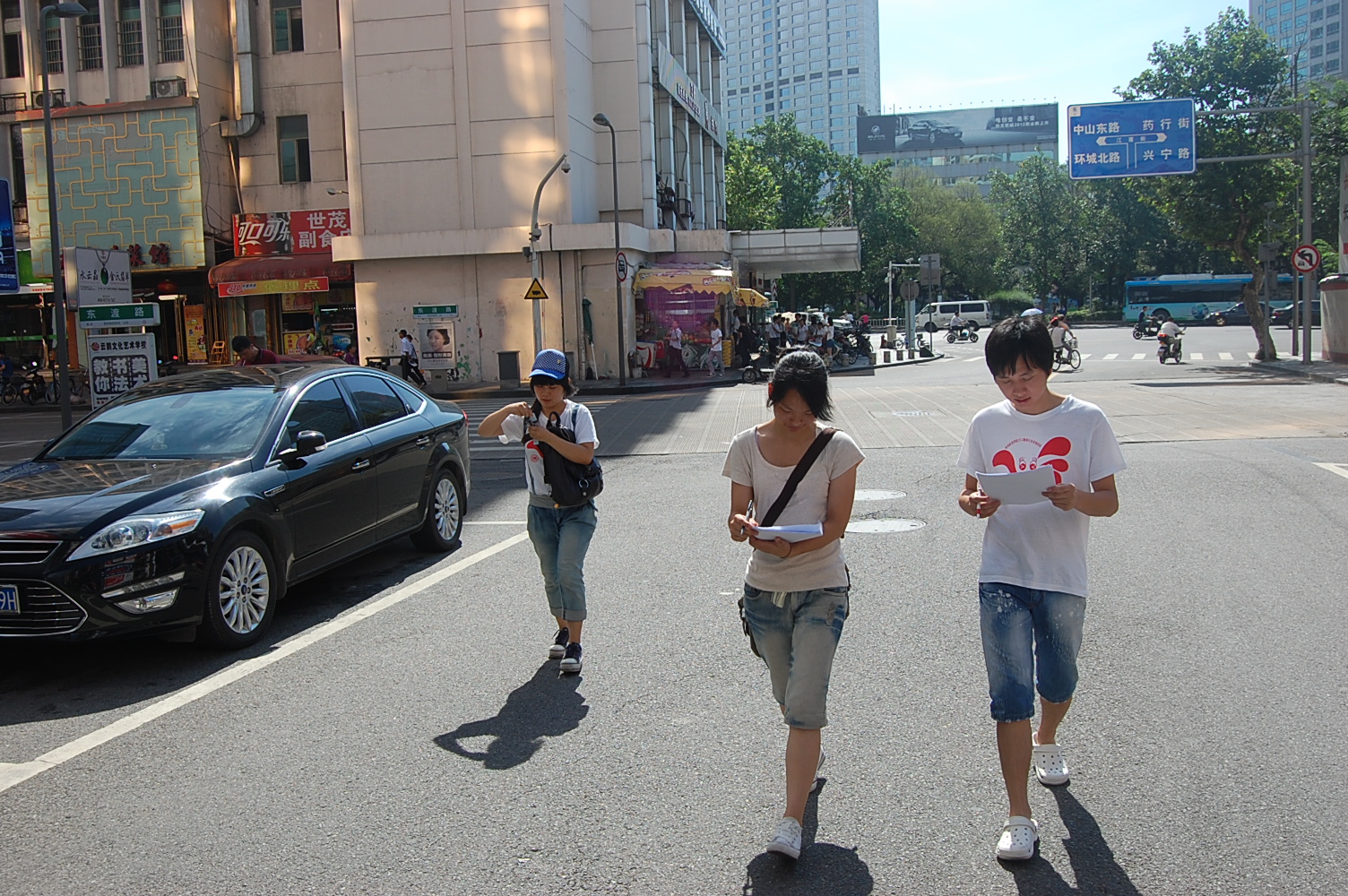 但随着慢慢的接近中午,天气就变得来越闷热了,火辣辣的太阳让人群躲向了建筑群,而后跟着进去的我们遭到了保安叔叔的打扰,本想去广场管理中心开个证明,不料周日没人上班,只好怏怏的又走到路边做问卷。这也告诉了我们:做事情还是欠考虑。我和队长一起走出了天一广场,来到了城隍庙,再是月湖,一路上有着各色各类的人,发现了自己为啥这么犯贱,别人的问卷都是自己乱填,而我们的却要顶着37度的大热天,祈求着别人做这个问卷。又饿又困的我们在11点多随便吃了点午饭,稍作休息之后大家集合来到了车站:灵桥西,随后乘车又去了万达广场。