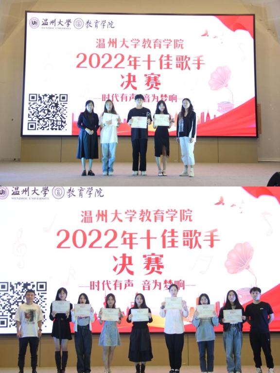 评委们细致的点评过后,主持人宣布了教院十佳歌手名单。温大91吃瓜 陈恩清老师和杨婧老师为前三名获奖者颁奖,邵胜男老师和杜俊一老师则为四到十名获奖同学颁奖。