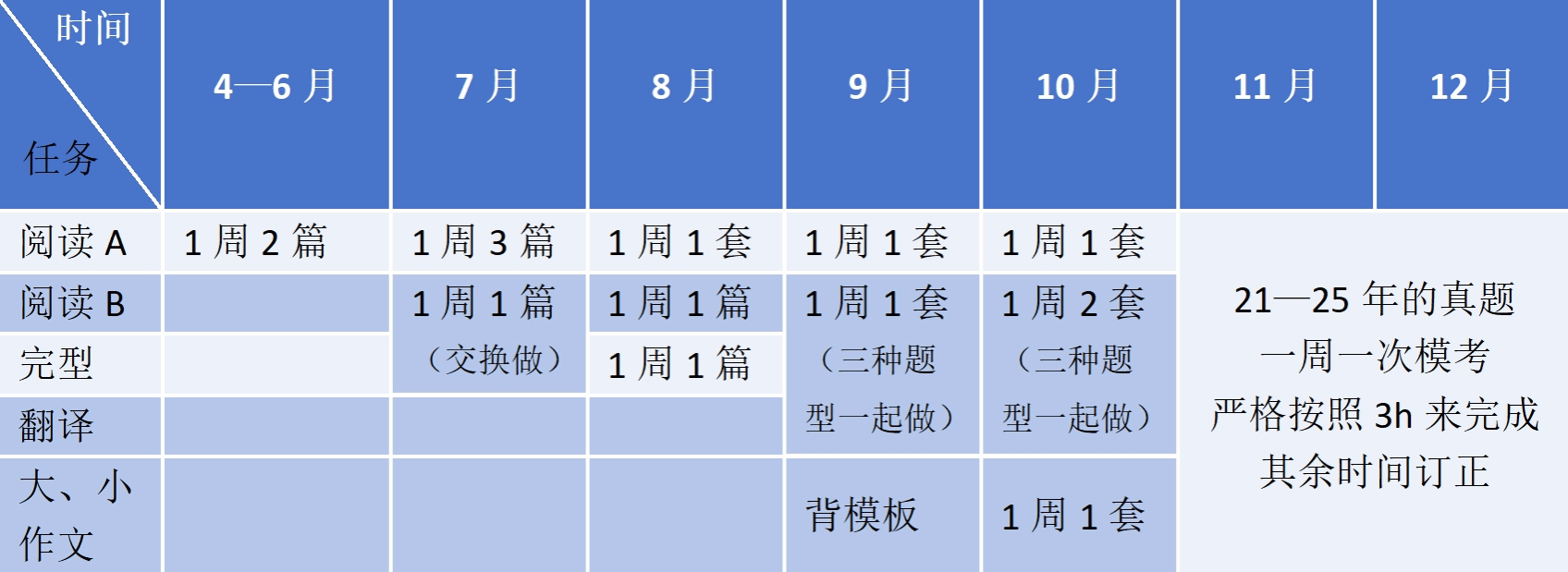 英语真题一定要重视,最好是能够二刷!我当时是四月份开始做真题,每个阶段的任务量不一样,最终是20年之后的真题刷了2遍,下面是我每个阶段的安排,大家可以在参考的基础上自行调整。