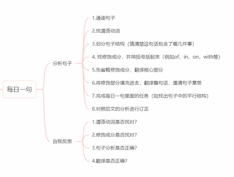 语法我是跟田静的每日一句,《句句真研》感觉没必要,太基础了,直接跟每日一句就行。当然啦,每日一句不是简单看一下就好,我们要充分利用这些句子来帮助自己学会拆分句子、读懂文章,我用一张思维导图告诉大家利用好每日一句~