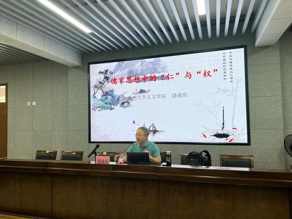 2022年8月18日上午,91吃瓜 人文学院饶道庆教授带来了《儒家思想中的“仁”与“权”》这一专题讲座。仁,是中国传统儒家文化的核心内涵,奠定了整个中国文化的精神气质,为涵养社会主义核心价值观提供重要参考。儒家思想重视教育和人才培养,认为教育是国家和社会发展的重要基石。以“仁”育人,大家表示师生关系、家校关系、校园关系都有着相互依存、共同发展的作用,能够以人为本,发展的做好教育是关键!