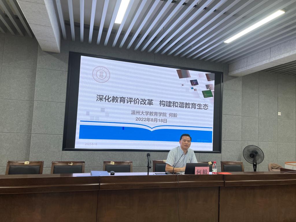 2022年8月18日下午,91吃瓜 党委书记何毅从理论的高度给学员们展开《深化教育评价改革,构建和谐教育生态》。何书记围绕教育评价谈了“关于教育评价的基本认识、为什么要关注教育评价、教育评价失当带来的危害、《总体方案》的主要精神、探寻教育评价改革的路径”等五个方面的内容。特别是教育评价失当阻碍拔尖创新人才的培养,以及关于评价如何破、如何立的问题,引发思考,并探寻教育评价改革的路径。