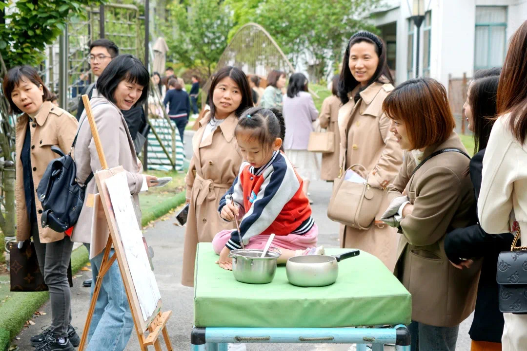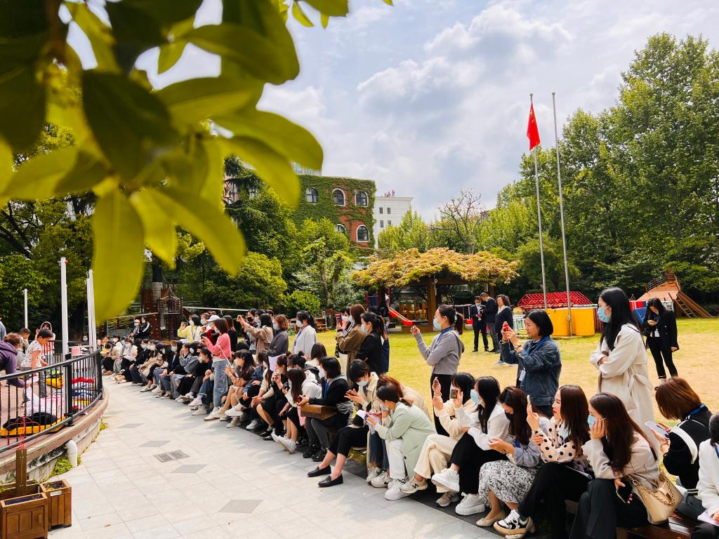 24日上午,参观上海市宝山区青苹果幼儿园(中环园区)。在副园长焦清竹老师的介绍下,学员们了解到青苹果幼儿园坚持“赋一份‘自主’,启无限‘可能’,焕发每位幼儿的生命活力”的办园理念;以“自主选择”为“支点”,以“自主提出、自愿结伴、自主策划、自主实施、自由分享”为实施路径的特色课程活动,充分鼓励自主,支持幼儿的个性化发展。余晓蕾、刘珊雪霏、黄豪芳三位老师为学员们进行了《融一日生活 促自主管理》《不一样的毕业典礼》案例分享,真正让大家感受到自主游戏的魅力所在。空场地上,到处都是孩子们尽情游戏的身影。他们用各种自然物玩着泥巴、野外烧烤、丛林探险等生态自主游戏,还用形式多样的低结构材料进行角色扮演,让学员们惊叹不已!