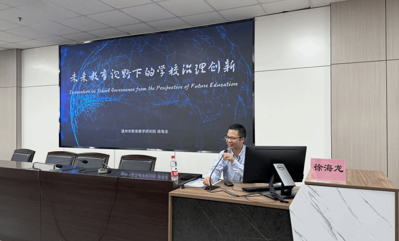 温州市教育教学研究院书记、院长徐海龙给我们做《未来教育视野下的学校治理创新》的主题讲座。徐海龙在讲座中强调,“未来教育”是温州近年来探索打造的具有辨识度的品牌。“未来教育”学校应全面构建为了未来、面向未来、开创未来的教育新体系、新形态。他还指出在区域、学校、学生层面打造属于温州“未来教育”体系。他重点阐述“未来教育”学校应聚焦一个核心——未来学生培养,围绕未来空间的打造、未来课程的设置、未来学习的变革、未来教师的培养、未来知识的转变五个实践点,培养全面健康个性发展的未来学生。