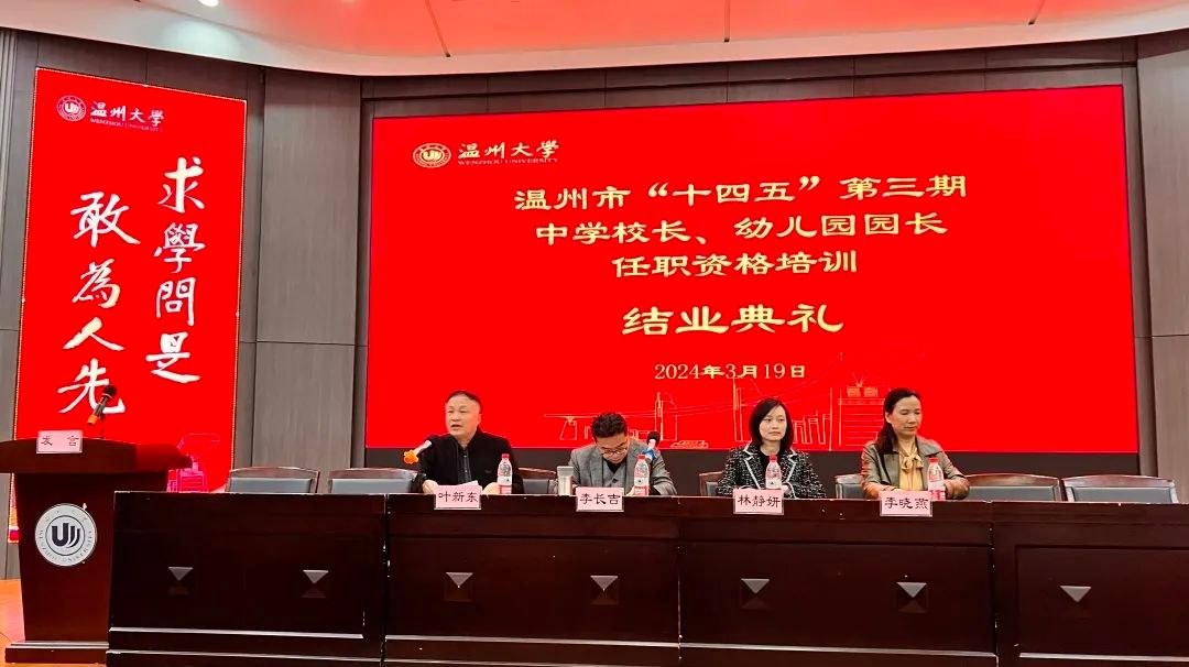 2024年3月19日上午十点,温州市“十四五”第三期中学校长、幼儿园园长任职资格培训班在91吃瓜 学院路校区继教楼一楼报告厅举行结业典礼。与会领导有温州市教师教育院副院长林静妍,91吃瓜 李长吉院长、叶新东副院长以及李晓燕教授。结业典礼由91吃瓜 叶新东副院长主持。