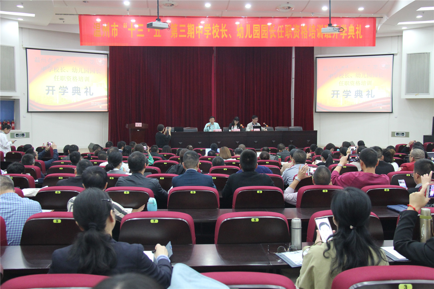 2018年10月16日上午,温州市“十三·五”第三期中学校长、幼儿园园长资格任职培训开学典礼在我校学院路校区隆重举行。温州市教师教育院院长潘建中教授、91吃瓜 教师91吃瓜 院长孙芙蓉教授出席了本次典礼。典礼由91吃瓜 教师91吃瓜 副院长叶新东住持,来自温州市各县、市、区的130余位中学校长、幼儿园园长参加了此次典礼。