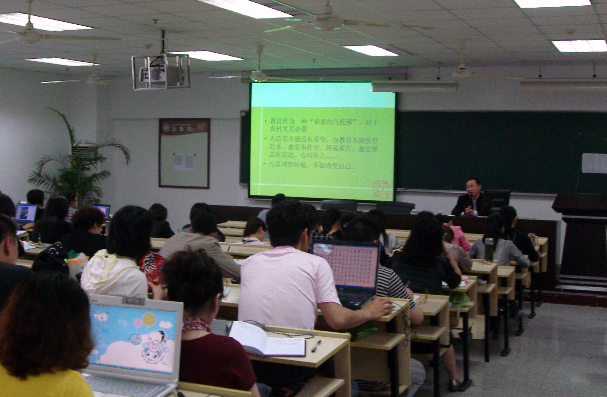 5月5日,江苏省徐州市名校长曹玉辉为鹿城区和龙湾区小学校长任职资格培训班的全体学员作了题为《特色在文化中破茧》的讲座。曹校长介绍了自己学校通过书法和读书两个特色项目营造和提升校园文化,打造品牌学校的经历,向学员描绘了一个乡村教育的乌托邦。曹校长的讲座语言生动且结合实际,现场反响热烈。课后学员表示曹校长的讲座对其学校工作很有借鉴意义,受益匪浅。