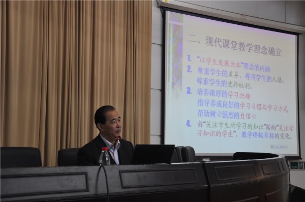 上午,谢利民教授为全体学员带来了题为“新课程背景下的教师教研能力发展”的专题讲座。谢教授深入浅出向全体学员指出了教师教研能力发展的必要性,很好地回答了学员们在教研方面存在的疑惑,并指出了中小学教师如何提高教研能力的方法。课上,谢教授妙语连珠,幽默诙谐的讲授,得到了广大学员的极大欢迎,课后,很多学员都纷纷反映深受启发。