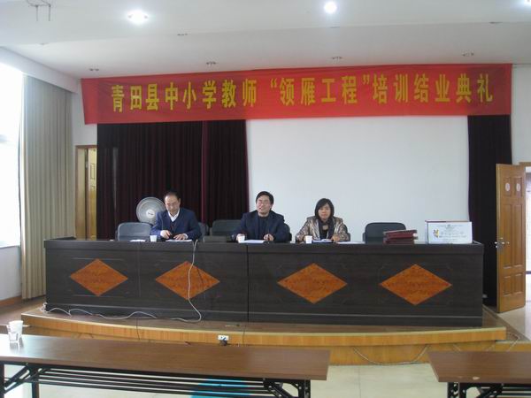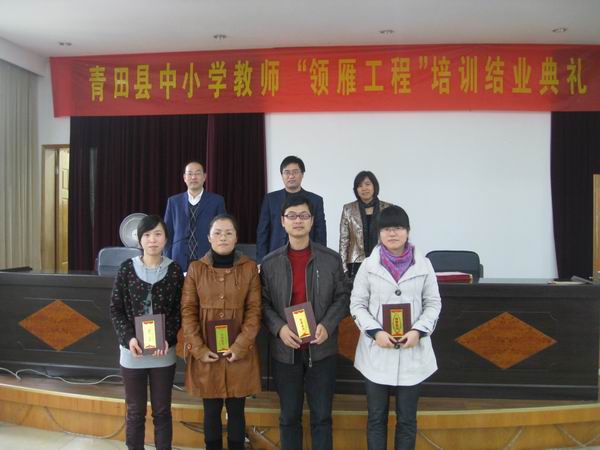 下午在青田县教育局的报告厅内举行了青田县农村中小学“领雁工程”学科骨干教师培训班结业典礼。青田县教育局周霞副局长,胡来林常务副院长和青田县教师进修学校任震宇校长参加了典礼,任校长担任主持。典礼上,周局长和胡院长都做了热情洋溢的讲话。周局长对此次培训的过程和结果表示十分满意,评价此次培训 “安排的非常科学、针对性强、要求严格、培训质量高”, 嘱咐参训学员要把本次的培训成果带回青田并运用到实践中去为青田基础教育做贡献。胡院长对此次培训工作做了总结,并对参训学员提出了殷切的希望。会后,还举行了说课比赛,颁发优秀学员证书。