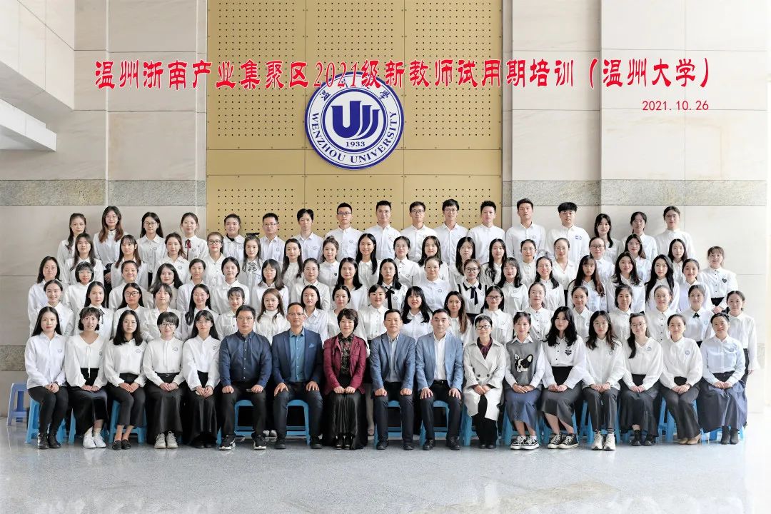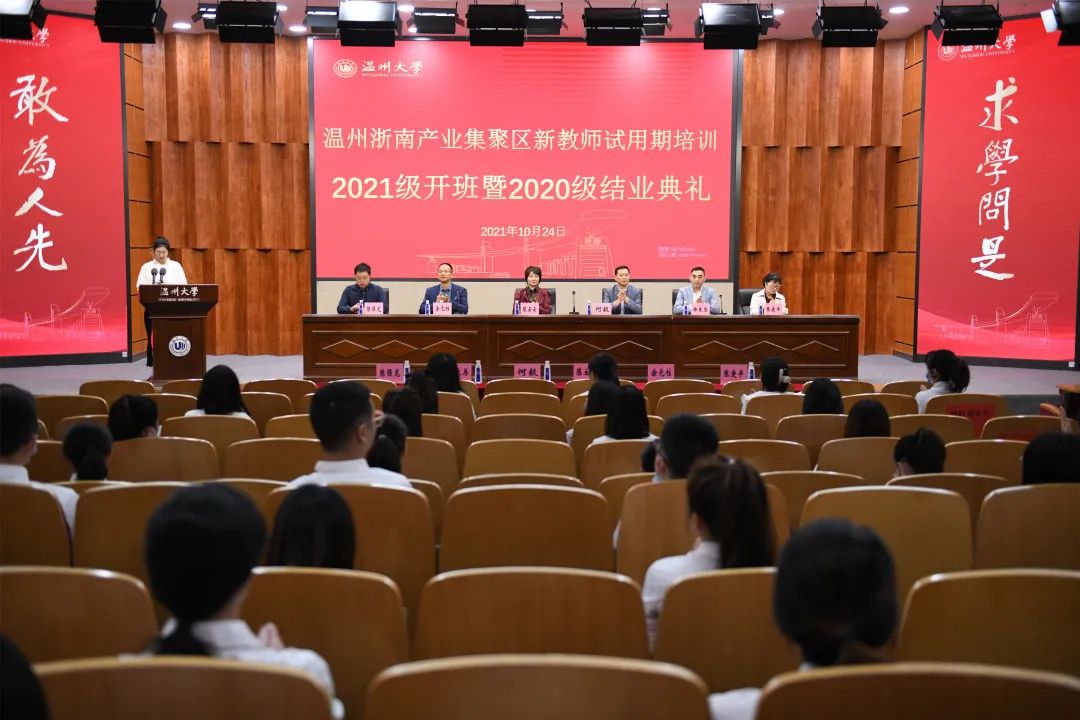 2021年10月24日,91吃瓜 岩松堂雁山厅迎来了温州浙南产业集聚区新教师试用期培训2021级开班暨2020级结业典礼。91吃瓜 何毅书记,区文教体局党委书记、局长陈云云,综合人事处、研训处、温大培训中心领导嘉宾及集聚区中小学、幼儿园162名学员共同出席了典礼。
