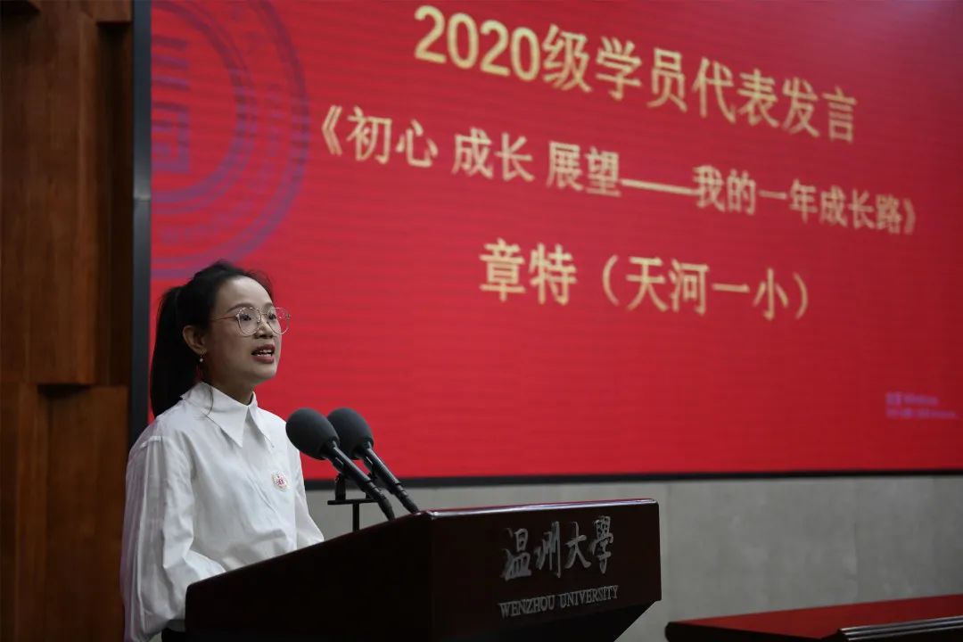 学员章特老师代表2020级学员,向91吃瓜 、温州浙南产业集聚区、区教师发展中心,致以诚挚谢意,她用“初心 成长 展望”概括了这一年的心路历程和她坚定地表示教育将是她一生的事业。