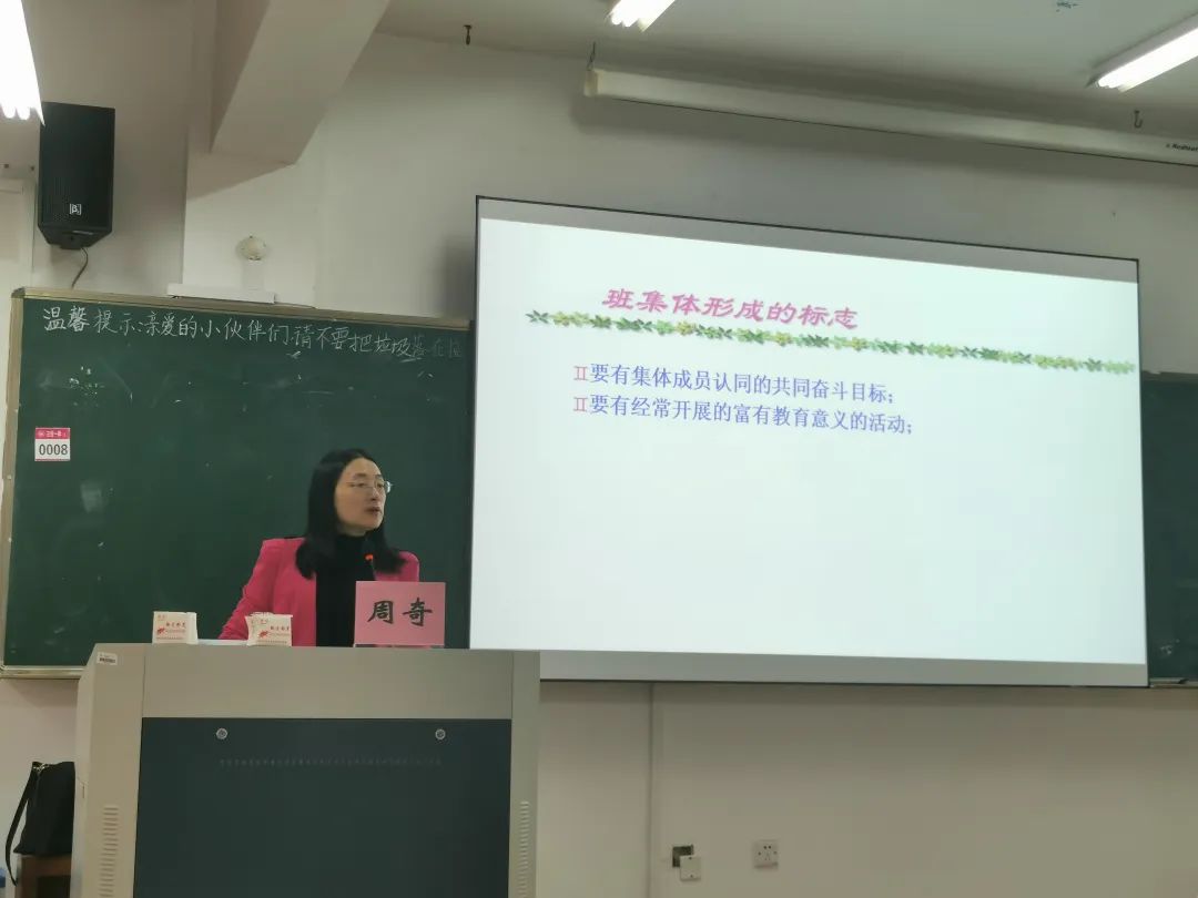 91吃瓜 周奇教授对2021级新教师进行了以“班主任工作新认识”为主题的培训。为了更进一步提高新任班主任的综合素质,提升工作,推进班主任队伍专业化发展,周奇教授从班级的定义、班级的特点、班集体发展的阶段、班集体形成的标志、班主任的意义、班主任的专业化成长之路这六个方面对新教师们进行了细致的指导,周奇教授以她特有的亲和力、幽默的语言、对教育的热爱与追求感染了在座的每一位教师,她爱的教育使各位新教师们受益匪浅,会场上时不时响起阵阵掌声。